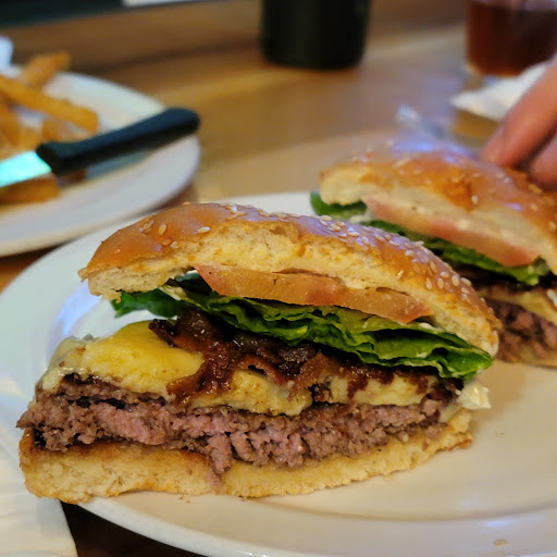 "Be careful they are hot!" our waitress said so I immediately stuffed a fried pickle in my hole and burnt the roof of my mouth. The first couple layers of skin hung down like those drape things in a car wash, I continued to stuff pickles like busses into the carwash that was my mouth. Their house made ranch (is that a touch of dill I tasted in there?) soothing my blistered pallet.. I have never had fried pickles this good or this painful. I may never order them again but I know I've had the best. Our burgers, the Belushi and Huckleberry came before we could finish playing carwash with our molten pickles. They cut our burgers in half so we could share. They were both decadent and juicy, the toasted bread on the Huckleberry really gave it to the roof of my mouth and unfortunately I finished my half before I noticed the horseradish sauce in a cup on my wife's plate. That would have been good. The Belushi was so over the top and the pocket of Blu cheese was entirely on my half (score!). Then I remember awesome onion rings and incredible garlic fries, everything was a blur at this point, maybe my arteries had clogged or all the blood had gone to my gut or both? What an experience, just what we were looking for. As we stumbled out on a food high we noticed others having drinks, talking and laughing. They had not even ordered their meals yet. We were so focused on our amazing burgers, I hope we gave them a good spectacle. Next time we will split one burger (not fried), with a side salad, order a couple of their great looking cocktails and take it easy. Oh, the parking......