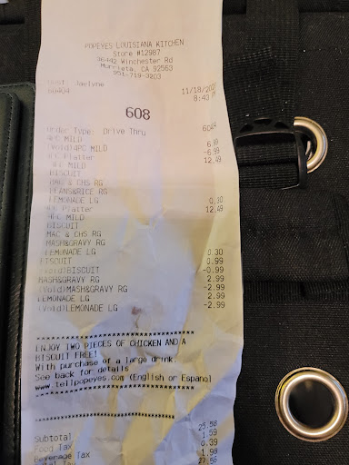 Read moreI was debating whether or not to leave this review as I typically do not have issues at this location. But it is a great learning opportunity for the Manager, Veronica. My other half went Popeyes last week and ordered the 25.00 meal Which included 10 chicken, 6 biscuits and 2 large sides. We brought the items home and noticed that the biscuits were not in the bag, assuming it was in the large box only to find the chicken. After realizing the issue, we called the store right away explaining the mistake. We spoke to Elliot, who resolved the issue and mentioned that we could come in the next day and that he would give it to us, he was great. Life happened- we got busy, as Popeyes is out of our way we could not pick it up so we went the day after which was Sunday, not thinking this was a big issue at all, as it is biscuits I did not call ahead to give a warning. My other half went and was told that she could not have the 6 pieces of biscuits as Elliot was not working that day and didn’t leave any notes. Her words were “we can’t just give out free food” and when she told Veronica her name she said “if that’s the name you gave him, I guarantee he would not have wrote that down” as if it was too long or complicated, her name is 8 letters long and not complicated in the slightest. Veronica explained that we have to come back when Elliot worked after she drove all the way out to get these which is a mistake made by the packer, not us. Veronica, I did not realize that you were the manager until I read earlier comments, you have a lot of great reviews maybe it was an off day but we are managers too both my other half and I. Making a customer go back again for 6 pieces of biscuits is absurd. Of course we would not want to come back, the cost of gas was more than the biscuits. Even if you may not have meant what you said in a way of assuming we were “lying” or being “deceiving” its definitely how it sounded. It’s both what you say and how you say it. Please understand that going forward, to not lose customers over 6 pieces of...