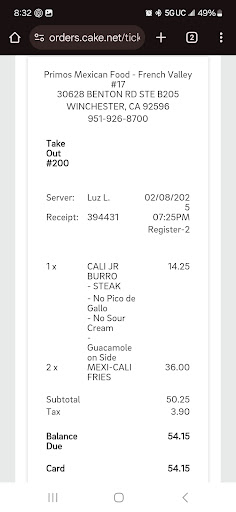 Read moreToday i went into store in winchester. My order was taken by b. Madison. I ordered t orders oftwo hard shell beef taco combined with rice and beans. She only entered one order. So I waited and repeated the once sgain. I wanted two large drinks but recieved one lsrge and one medium. Now its wednesday and special reads with any item rice and beans or fries is $ 3.00 but i get charge twice the $4.00 charge. When i madison to refund the difference of $2.00. She indicated that she could not only a mgr could refund . There was no manager on sight nor would she issue the refund. Then my order recieved no fork, napkins, or hot sauce. I had to ask. She spent most of her time chatting with the cook. Obnioysly not focused or properly trained by a real manager. This resturant has poor service and reduces the need to bring them business. This young lsdy displays a disloke to hsr employment train her to respect and proper etiquette or fire her. This is a common issue at Primos and the owners need to pay...