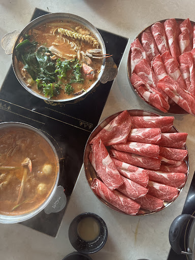 For the broth, I decided to order the fire crab (+4) and a regular size chicken for the meats. I guess we had gotten a free upgrade being that it was during the week. The server brought out the vegetables in a bowl which consisted of noodles, tofu, lettuce, and other greens. The broth was deliciously flavored with a nice undertone of spice and seafoodness. There were two pieces of a crab within the broth. The server never asked me if I wanted any spicy drops which was okay because the broth had a level of spicy that was just right for me. The chicken platter had four balled up amounts of ground chicken and about 8 slices of thin chicken. These cooked fairly quick with the vegetables. Dipping and smothering the pieces of meat and vegetables into the sesame sauce, it was deliciously incredible. After finishing most of the meats and vegetables, I decided to place the remaining vegetables into the broth along with the noodles, then after being cooked, I now had my noodle soup to finish it off. The service here was great and the prices were very reasonable. My total came out to $43 with my girlfriend ordering...
