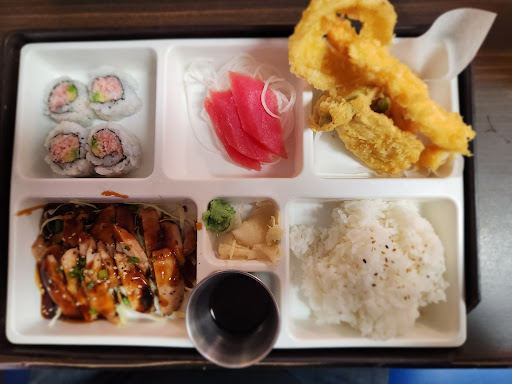 Perhaps if we were in a position to try the sushi, our experience would have been better. But we were on our way out to the deep woods and would not eat our food for 4-5 hours after we picked it up to go, so we got fully cooked food: Chicken Teriyaki and Spicy Pork. It was supposed to come with soup, but while we were waiting, the woman brought out soup for us, and told us to sit down and eat it. We wanted it to go. When I told her I did not care to eat my food now (we had a hike ahead of us, and we hike fast for a workout, I did not want a full belly of hot soup on a warm day for an arduous hike), she gave the soup to someone else, rather than putting in a to-go container for us. We did not ask to eat our soup then, and it was very presumptuous to tell us to sit down and eat. So we paid for it for nothing. I had seen pictures online of what looked like teriyaki chicken on a bed of cooked veggies and that's what I thought I was getting, instead I got sticky, sushi rice under my chicken. It was dry and the sauce only got on a bit of the rice, so I ate cold sticky dry rice with dry chicken. It was hard to choke down, and frankly, the sauce left a lot to be desired and there was hardly none of it. The tempura that came with my dish was really greasy like the deep fryer was not to a hot enough temperature when they put it in and it absorbed too much grease. The gyoza were the best thing, and they were good, but not great. The salad was merely iceburg lettuce (who even serves that anymore?) with crushed peanuts and a cream based dressing that tasted like it had 7-up in it or something sweet and fizzy in it. All put together it was not horrible, but very one-note and as someone who LOVES veggies and salad, I did not eat it all. Way too much money to throw that much of it away. My husband's Spicy Pork was better, with a decent amount of sauce, but again served on sticky rice, that should be used for sushi and is not pleasant to just eat. Again, perhaps when we have time to stay and eat it will be better, but for to-go food,...