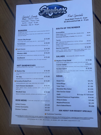 Read moreMy group of 10 wine lovers from the Midwest needed a change of pace from the lunches served at the wineries. We selected on one of the closest locations and could not have been more satisfied with the food and service (from Ashley) at Skybox.