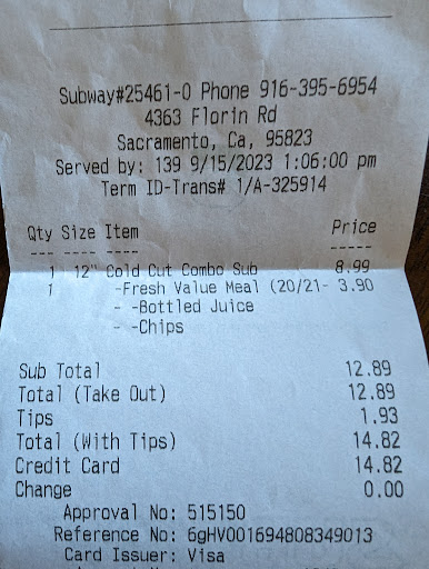 Read moreORDERED THE PASTRAMI SANDWICH & IT WAS LOTS OF FAT ON THE PASTRAMI.... MADE IT HARD TO EAT, VERY CHEWY... FOUND MYSELF PICKING THRU THE PASTRAMI TO EAT MY SANDWICH... VERY DISAPPOINTING, I USUALLY GO TO TOGOS, BUT MY FIANCE & NEPHEW WANTED SUBWAY... BAD DECISON 👎