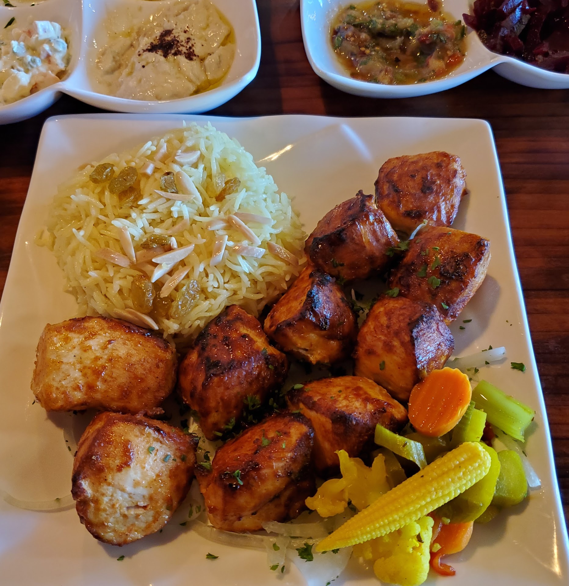 Read moreWe were looking for authentic middle eastern food while we were in the Sacramento area. (Our group was middle eastern and familiar with the food, from many different arab countries). We went in a couple hours before closing, restaurant was nearly empty but felt welcoming. We sat at the table for almost 20 minutes before anyone even came to ask us if we had been served. When we finally ordered, they were out of everything our party wanted (no beef or lamb kebobs or tikka sooo no mixed grill either). We decided to order the Araby wraps as it was late and a last resort. We tried both the beef and the chicken. The food took a SIGNIFICANT amount of time to arrive, despite being a nearly empty restaurant. In the meantime they brought us lentil soup which was tasty (albeit missing a lemon wedge that traditionally served alongside this dish in our house, so it was a little flat). Once the food arrived, we tried the wraps. It is not a joke to say the wrap was at least 40% raw chopped onion. If the meat had flavor you wouldn't know it over the raw onion flavor. And the chicken tasted straight up like hotdogs. We shared around our party and the opinion was consistent. Our wraps came with appetizer plates and half of the appetizers tasted from a can (metallic tasting), while the others were not bad. At one point there was a child belonging to another part that was being disruptive so we asked the waitress to assist in asking him to leave us alone, and she actually sighed and acted annoyed at our request. We soon left our plates (nearly a full table) uneaten, asked for the check ($90?) and left. Having tasted many versions of middle eastern cuisine, both home cooking and restaurants, I'm not sure this is authentic. But we would not be back. While it is possible their kebabs would have been better tasting, I believe everything on one's menu should be delicious for the one...