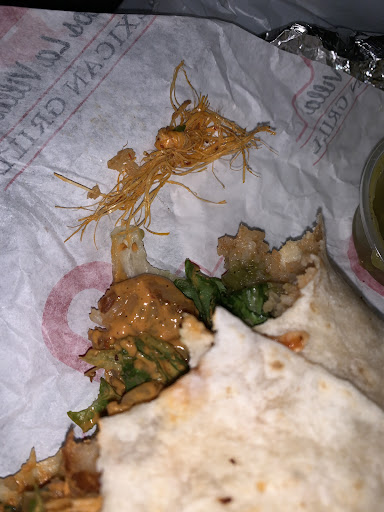 When we got home and opened everything up none of the food looked appetizing. But since we were starving, we decided to give the food a try. Big mistake. I was disgusted to find this robe/plastic whatever this is in my shrimp burrito. That was it for me. I am so upset, like how could the cook not see this huge plastic while putting the burrito together. Maybe it was because he was too busy messing around instead of making sure heās doing his job right.