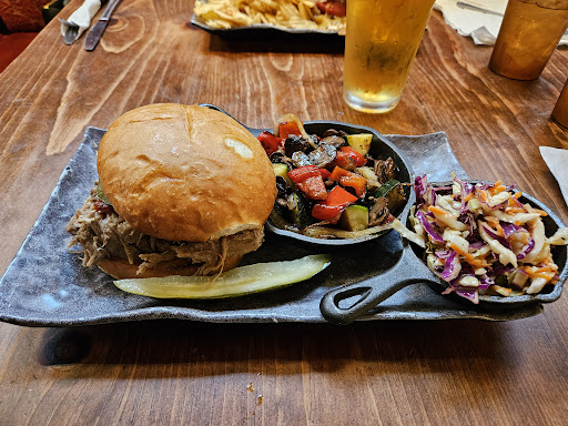 Stopped by early on a Friday for there. Reminds me of an old packing house or rustic dry storage facility. Really liked the old building it resides in. As far as food, wife had the coal burger with house made chips. Burger was kind of a smash burger style with a little crispiness on the patty and cheese. For me, It had a little too much lettuce on it, but good flavor and bun was fresh. I had the pulled pork sandwich with slaw on the side and roasted veggies. Pork was a little bland an kind of soggy. Same type of bun as the burger and had some pickled jalapeños on it but could have used some more bbq sauce to add some flavor. The slaw was bomb as well as the roasted veggies. Slaw was really good and made fresh. Roasted veggies were a lovely caramelized surprise of sweet peppers, mushrooms, onions and zucchini. I would definitely go back for the slaw and veggies. We brought the kids and they had a kids menu with some basic kid options. Girl had the hotdog and was on a toasted buttery bun and flavorfull dog. Overall, cool comfortable place with inviting staff and great...