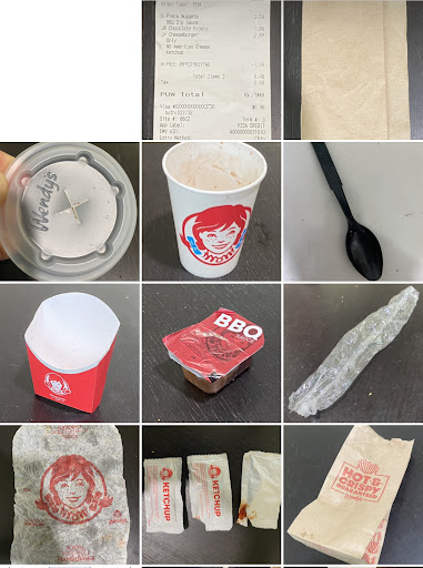 In addition to the food itself we received: 1 brown paper napkin (unlabeled) 1 Plastic spoon, black (Labeled I13) 1 Clear plastic bag wrapper for spoon (unlabeled) 1 small waxed paper cup (labeled 650328H) 1 Plastic cup cover (labeled PS-6 6 8) 1 Bleached white paper receipt. 1 Waxed paper chicken nugget container (labeled 20027497 324 10 copyright 2020) 1 BBQ dipping sauce plastic container (labeled 12909) 1 BBQ sauce foil-type cover (packaged by MFG#476 24.9 grams “4S”) 1 Bleached white waxed? Paper burger wrapper (labeled 2013 Oldemark LLC) 3 requested ketchup packets in foil-type packaging (labeled as “ketchup“ packaged by MFG#476 “1Cw”) 1 Small-Medium size brown paper bag (labeled 5# item count 1-2 100% recyclable, 40% post consumer recycled content, made by Ronpak in USA c2021 205122205321)