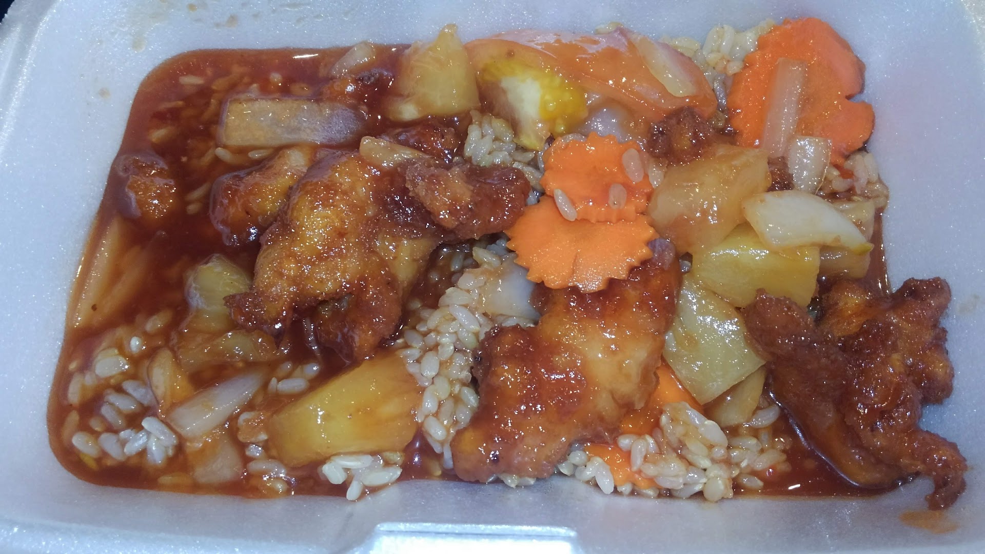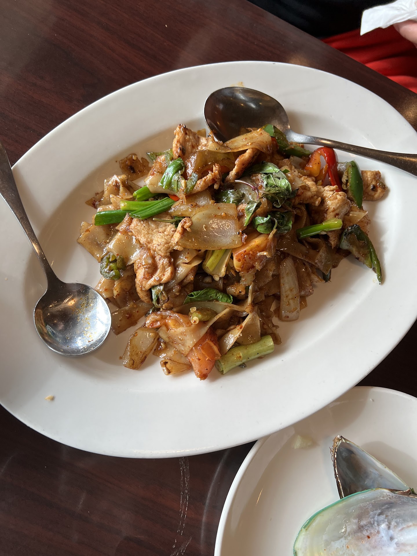 Food was excellent. Best orange chicken I have ever had with having been to maybe 50+ Thai place in LA/Orange/San Berdo counties. No wimpy orange sauce here, it has lots of orange zest in the sauce. We had summer rolls (these are suprising very good; i loved the green sweet/spicy sauce that it came with; with peanut sauce as well) and satay which 2 of the 4 pieces of chicken had a little too much cartilage, but still spiced and cooked well. Ginger beef was very good with lots of fresh ginger strips. Pineapple shrimp/chicken fried rice was very good. The spicy noodles were outstanding but at medium spicy I could have had a glass of milk to quell the heat (so, little spicy goes a long way here and I like spicy).