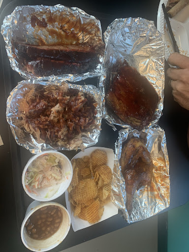Great little BBQ place. We stopped in while traveling for dine in but they do take-out and catering as well. The food was pretty good over all. The ribs were juicy and tender. I didn't taste a lot of smoke but they had good flavor. The brisket was cut thick, with a defined smoke ring, good crust and very moist. The chicken was a little dry but it had good flavor and the rub on the outside was great. The pork was a little disappointing, as it was cold and did not have a defined flavor and was a little bland but adding their sauce worked great. The sauce was excellent and honestly will be great on anything you put it on. The coleslaw was good and complimented the meats well. The homemade chips were excellent and I ended up finishing the meal by putting their sauce on the chips. The biggest disappointment was the baked beans, seemed to come out of can, nothing special and Blah. Staff was great, service was good. portions and value for the dollar was good.