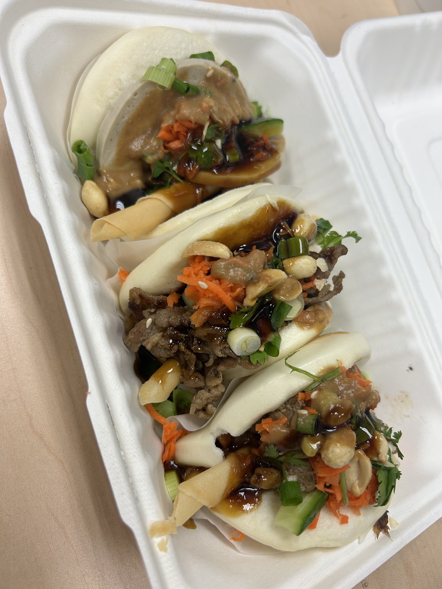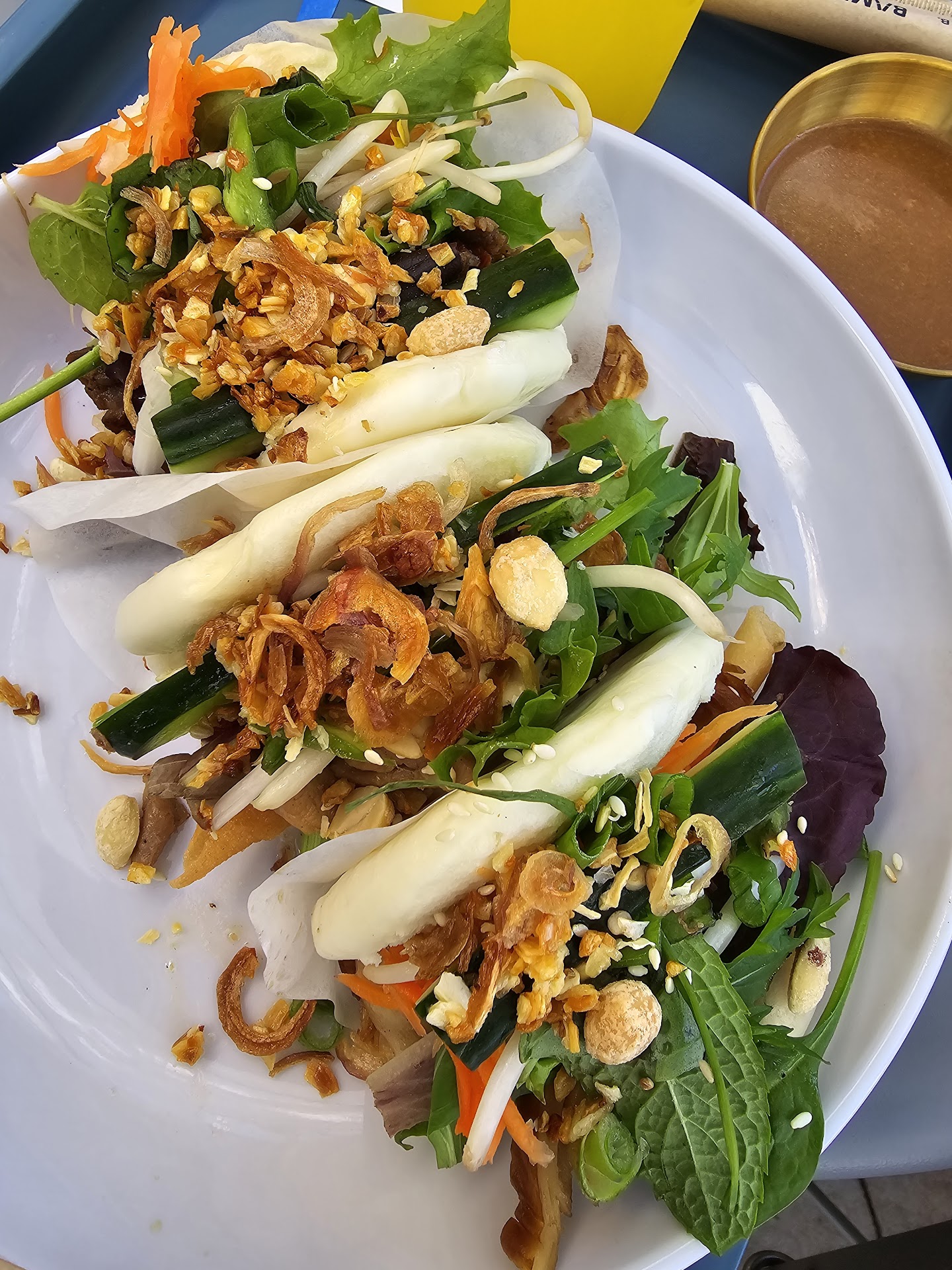 Read moreThe savory aromas hit you when you walk into this place to order. You get to "kraft" your own meal: 1. Choose a base from 5 different options (I went with 3 folded steam buns; 2. Choose 2 proteins (I picked beef, pork, and plant based duck for extra $); 3. Choose from 15 toppings (I picked them all!) and 3 sauces (I picked peanut sauce). What I got were 3 little packages of sensory deliciousness: so flavorful, with nuttiness, veggies, crunch, softness, spicy, pickley, and sweet. Every bite had it all. It was amazing. Just for fun, I also tried a 7 Wonders Lemonade. You can pick 1-3 fruits out of 10 options. I went with 2 mango, 1 peach, 100% sweetness. I am a water drinker; I never finish flavored drinks. I downed this entire 20 oz glass! I cannot wait to go back and...