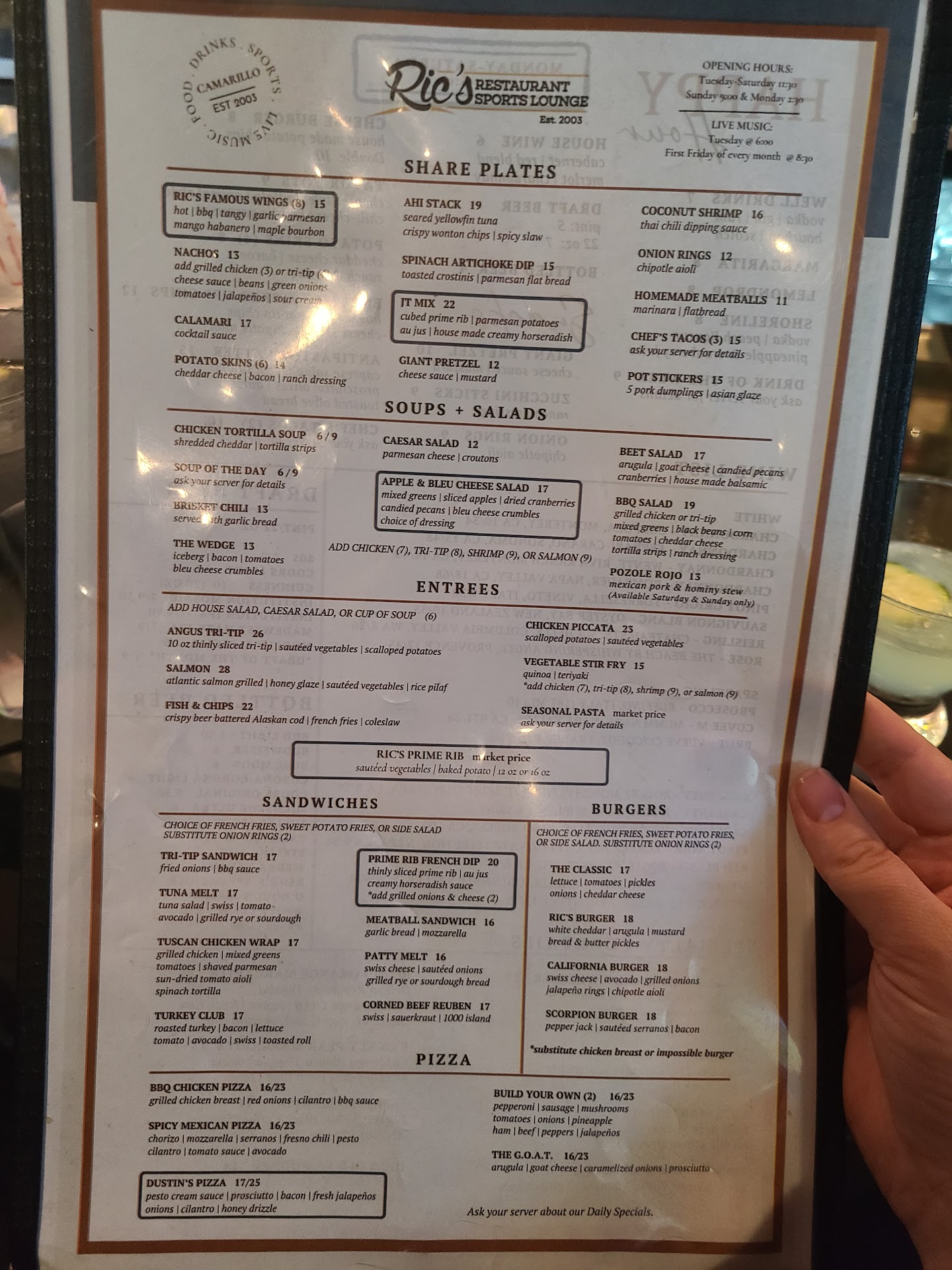 Rics delivers a solid experience with a few standout moments. The goat pizza was excellent—unique, flavorful, and definitely the highlight of the meal 🍕. The wings were cooked just right, but the lemon pepper and bourbon dry rub options fell flat. Both lacked the punch and distinct flavor you’d expect based on their descriptions.