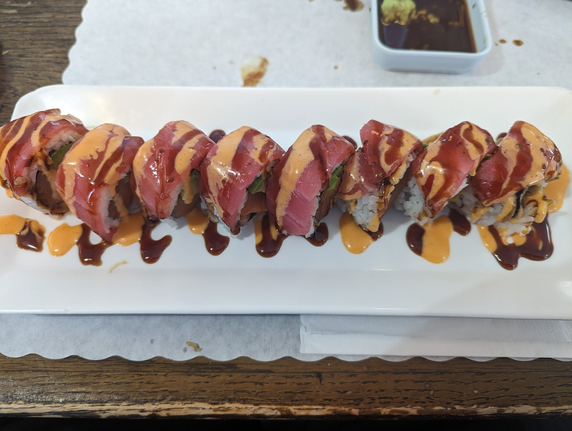 ย ย ย Read moreThe people were very nice and the service was prompt. The music was a combination of J-pop and classic country and that was fun, as were the music videos However, the quality of the fish was mediocre at best. I tried four different varieties of "fresh" fish sushi plus the spicy tuna. The salmon, tuna and yellowtail all were fairly tough and the tuna appear to have been dyed. It was a lurid dark red. The Spicy Tuna was grainy. The snapper was ok. The rice was cold and unseasoned. I had specifically asked when I sat down what was fresh and good and four out of the five dishes where neither. Still, nice people in my service makes...