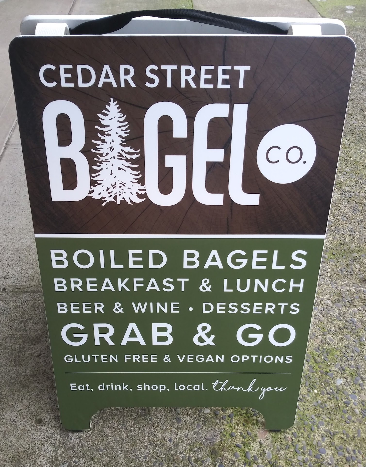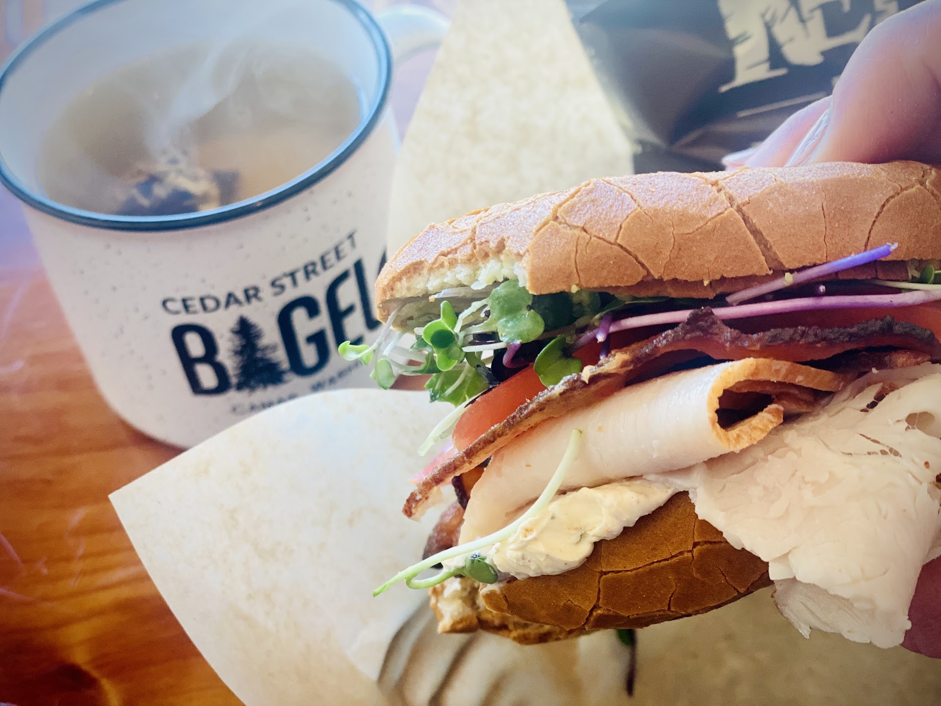 From start to finish, this was the perfect to-go breakfast experience. My family was hungry and all of us were craving breakfast sandwiches. We hadn't yet heard of this place, but used the Googles through the series of tubes to see if there was a place on this side of the river near enough that had them, and found Cedar Steet Bagel Co., not too far away. My partner decided to call our order ahead, and I was sitting close enough that I could hear both sides of the call. The woman who answered was very friendly, read back our order, and left us feeling we definitely made the right decision by the time the call was over. This was BEFORE getting the food. Then my daughter and her drove over, said the place was small, cute, and clean, and even had cool merchandise. They picked me up a really great quality branded mug as a gift for staying home to watch our kittens. Now for the food. The bagels were that perfect combination of soft and chewy. I got The Mighty on an asiago bagel with ham, plus avocado spread. Delicious doesn't even touch it. The best breakfast sandwich I've had, by far. The ham seemed to be of good quality, and there was more of it than I expected. The avocado spread was real avocado and was a perfect addition. They also surprised me with a cherry, cream cheese danish, which was flaky and excellent. The food was still hot when they got home, and they ordered additional bagels so we can enjoy them in the coming days. Couldn't...