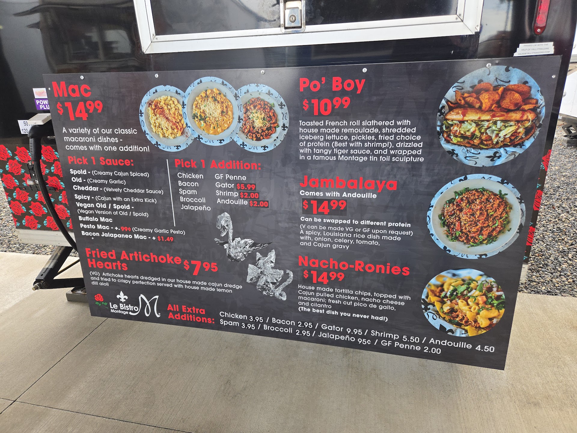 Le Bistro Montage Ala Cart is in the Oak Tree Station food cart park. They have a few other carts across the river but now we have one in Washington. They serve Cajun dishes like jambalaya and pro boy sandwiches but mac & cheese is their specialty. Those have a choice of "Additions": CHICKEN, BACON, GATOR, SHRIMP, ANDOUILLE, SPAM. For those with dietary restrictions they have, GLUTEN FREE PENNE , BROCCOLI and JALAPEĆO. I tried the Spold: "Creamy Cajun Spiced" with andouille sausage. My stepson choose the Spicy: "Cajun with an extra kick" with shrimp. Both were very good. His didn't taste spicier...but I bit darker. I'm trying that next time. At first I thought $15 for mac & cheese to be expensive. But the chorus of Le Bistro Montage fans celebrating having one in Camas sold me on giving it a try. It really is great. It is far richer, bolder and more flavorful than anything than comes in a DIY box. We sat in the in-closed seating area and enjoyed beer and cider. In case you haven't been to Oak Tree, the parking can be very challenging. My wife loves pasta. I'm taking her next. Check out my profile for more great eateries and craft...