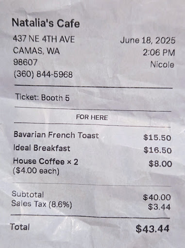 Read moreNatalia's Cafe has the best breakfast I have had in a long time! Nichole, our waitress, during the week, was so welcoming. Every morning she welcomed us back to the cafe and brought us our coffee without even asking! She was so personable and gave us ideas of how to spend our days in Camas. We felt right at home in this cafe. We had the CBT omelet with bacon, hash browns and toast. They were generous portions and delicious! The food was served piping hot and very fast. The coffee was delicious too. After a few days of having the omelet, I decided to try the brioche French toast. My husband and I split the omelet breakfast and the brioche. It was just the right combination of protein and sweet taste at the end of the meal. I thought the brioche French toast was the best until...A couple days before we left, I saw Debby's cinnamon roll French toast served to another customer. I asked Nichole what that was called. She described it is a homemade cinnamon roll with apples, battered and grilled. I only was able to enjoy it for my last two days. It was sooo delicious as they say, " to die for". The old American diner has counter space in front of the grill where you can watch the cook prepare your meal. The other side of the cafe is vintage soda shop with 50's decor and Flying A gas pumps. During the spring they do serve scoops of ice cream and milkshakes. You think you are in an episode of Happy Days. Besides the food, the people we met at the diner were so friendly! The owner, Erica, came over to our table to see if we had everything we needed. You can tell she has put her heart into this cafe and it really shines through! We will definitely be coming back for the food and...