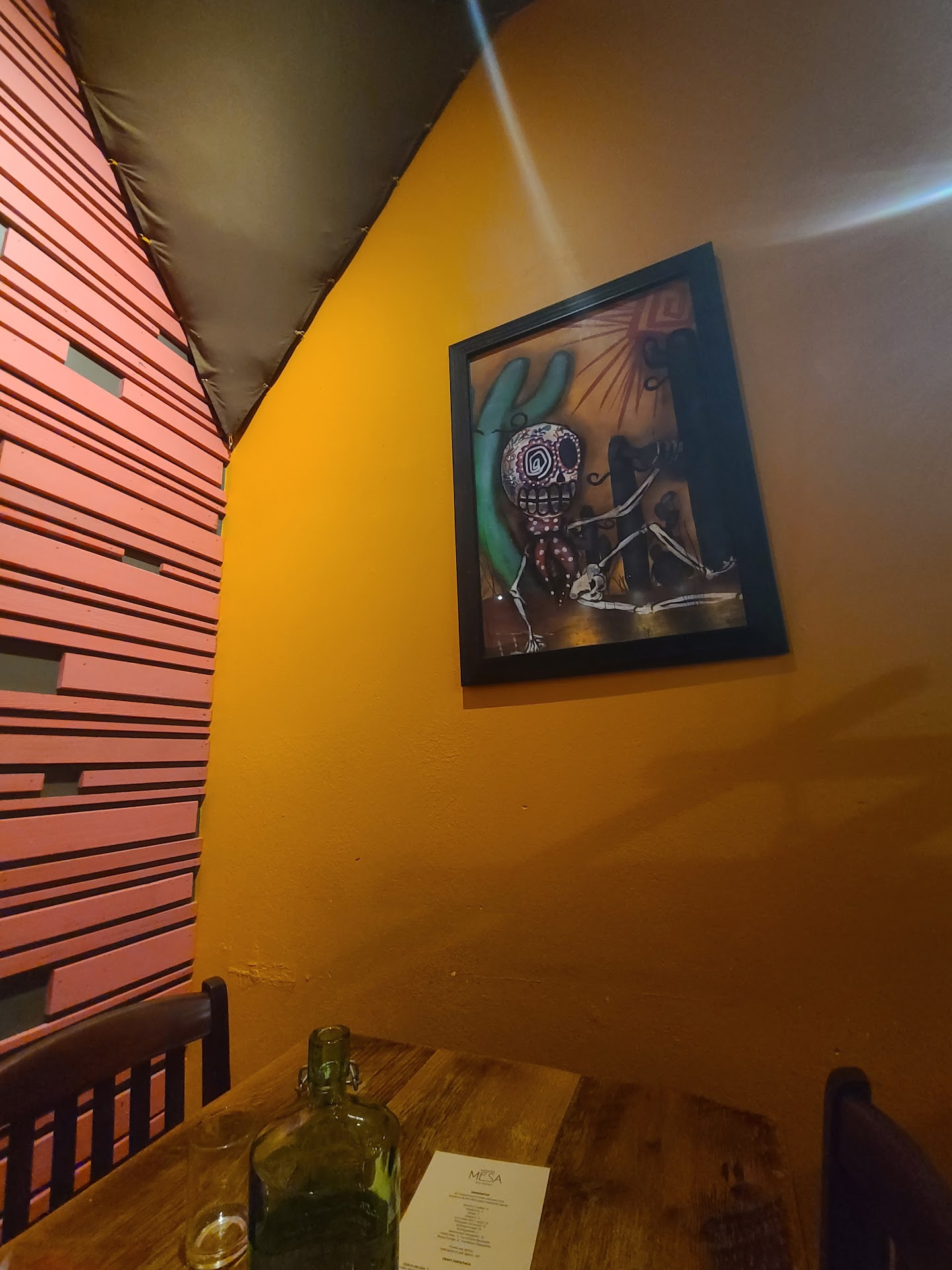 My husband and I went to Nuestra for Valentine's Day dinner. Our first time and we really enjoyed the atmosphere and the location, walked around the cute little downtown area after. The interior design is unique and art filled which is just up our alley, love all the unique touches. I am vegan and there were few, well only one option I saw on the menu - the veggies 'mesa bowl'. My husband is not, choosing to order 3 of the chicken tacos. We shared the chips/salsa/guac appetizer and I got the blackberry margarita which was excellent. We lived many years in San Diego and traveled Mexico extensively so we tend to be opinionated about Mexican food and we love the spice. I have to agree with other folks posting, the food is beautifully prepared. The chips are authentic, the salsa was a roasted tomato (best guess) and truly delicious. The guac was unfortunately bland. My husband said his tacos were somewhat cold when he got them. The food was delivered to the table very promptly so best guess this is because the tacos are served open face and there just isn't a good way to keep things warm that way. He also wasn't offered any taco sauce or salsa with them and said the chicken was relatively unseasoned. I'm afraid he's used to the way I make shredded chicken - with reposado/lime/chilies/seasoning so that it's savory but has a bit of a kick. But, I got it, because the lovely mesa bowl had few veggies (sorry, if I opt for veggies over meat then I do expect to get some veggies) - two slices of brussel sprout, some bell pepper and onion but little of that on a bed of rice / black beans. As far as seasoning, nothing special was going on there. I didn't dislike the dish, the items were well prepared as they were... added salsa and enjoyed the meal but I'd compare that to a meal we had at Christmas at Mi Corazon in Cannon Beach... we kinda wanted to bathe in their food. Well beyond my personal culinary talents and that's what's best about eating out in a fun restaurant... getting something truly unusual, something with just that touch. Nuestra Mesa was also the only restaurant I'd run across where the wait staff didn't offer dessert at the end of the meal. That surprised me, especially on Valentine's Day. We didn't ask, decided to go for a...