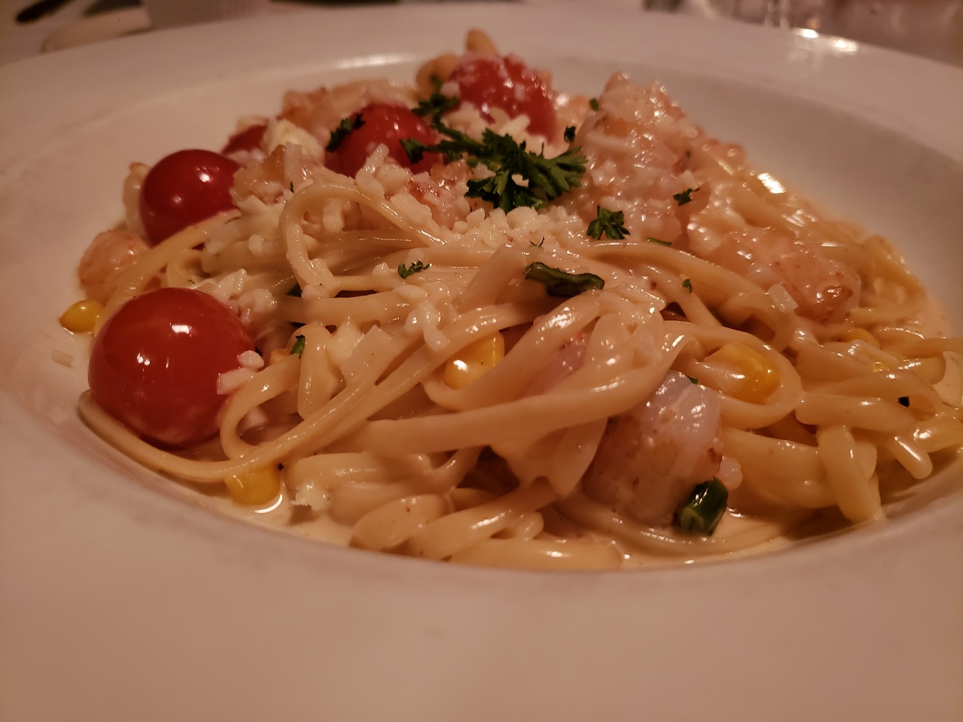 in this cozy ambience there were four separate groups dining, giving it the harmony of lane four at melody lanes bowling alley. one group of eight, one group of four, a party of two, and myself and my wife. need a visual?
