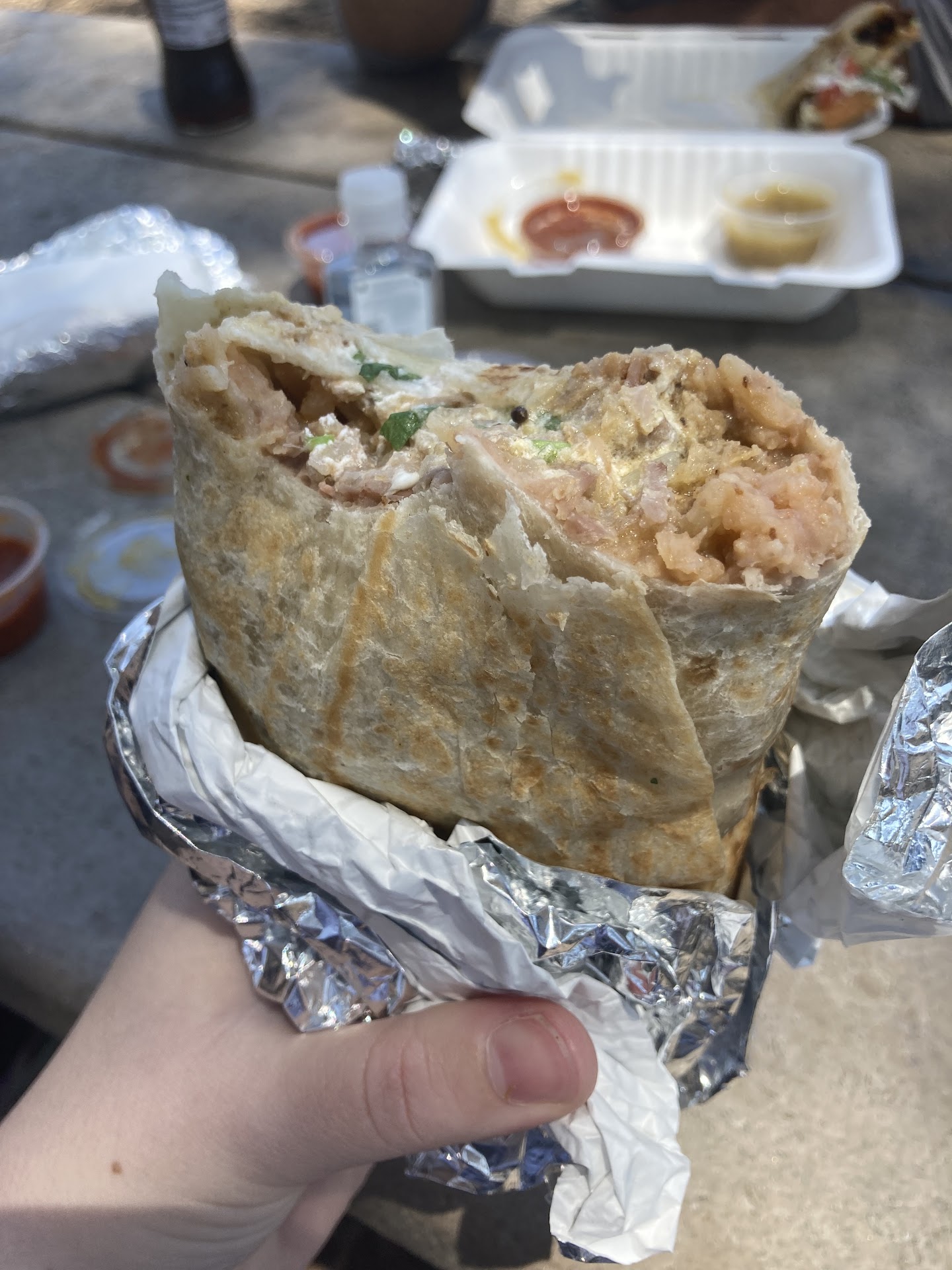 Highly recommend the breakfast burrito, which comes in 3 sizes. We decided on sz small each, which was perfect for a quick breakie before our road trip home. We had it with their famous al pastor and, yes, the salsa verde is truly special. I almost wish we had gotten another to...