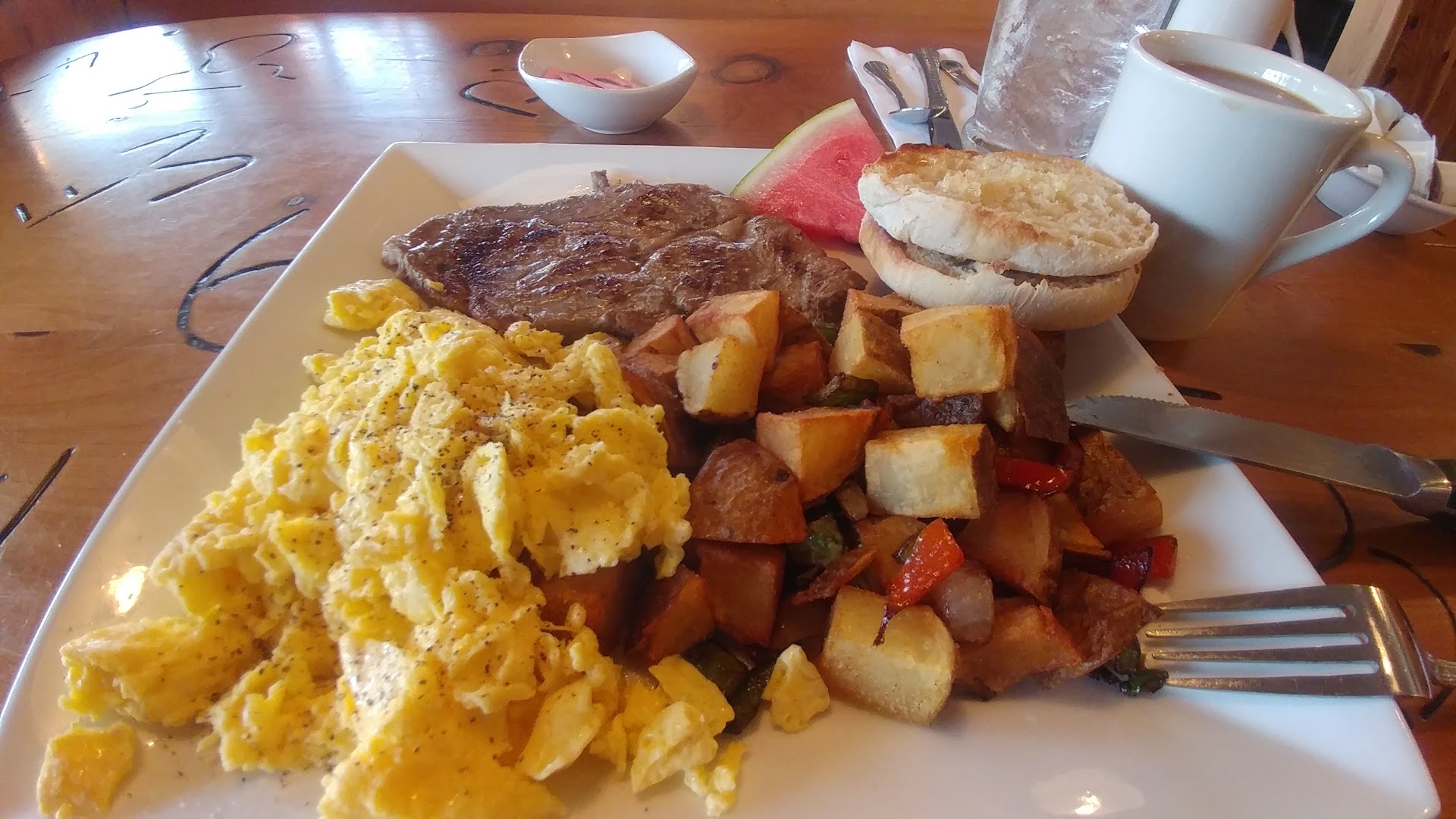 I placed an order for steak and eggs (medium well), and waited less than 10 minutes to get my food. My steak was cooked a little too well, but honestly it doesn't bother me, i just like a tiny bit of pink. It was thin steak but tasty. Everything else on the plate was good and it was plated in a hearty fashion. Overall i liked the environment, service, and food. No complaints at all.
