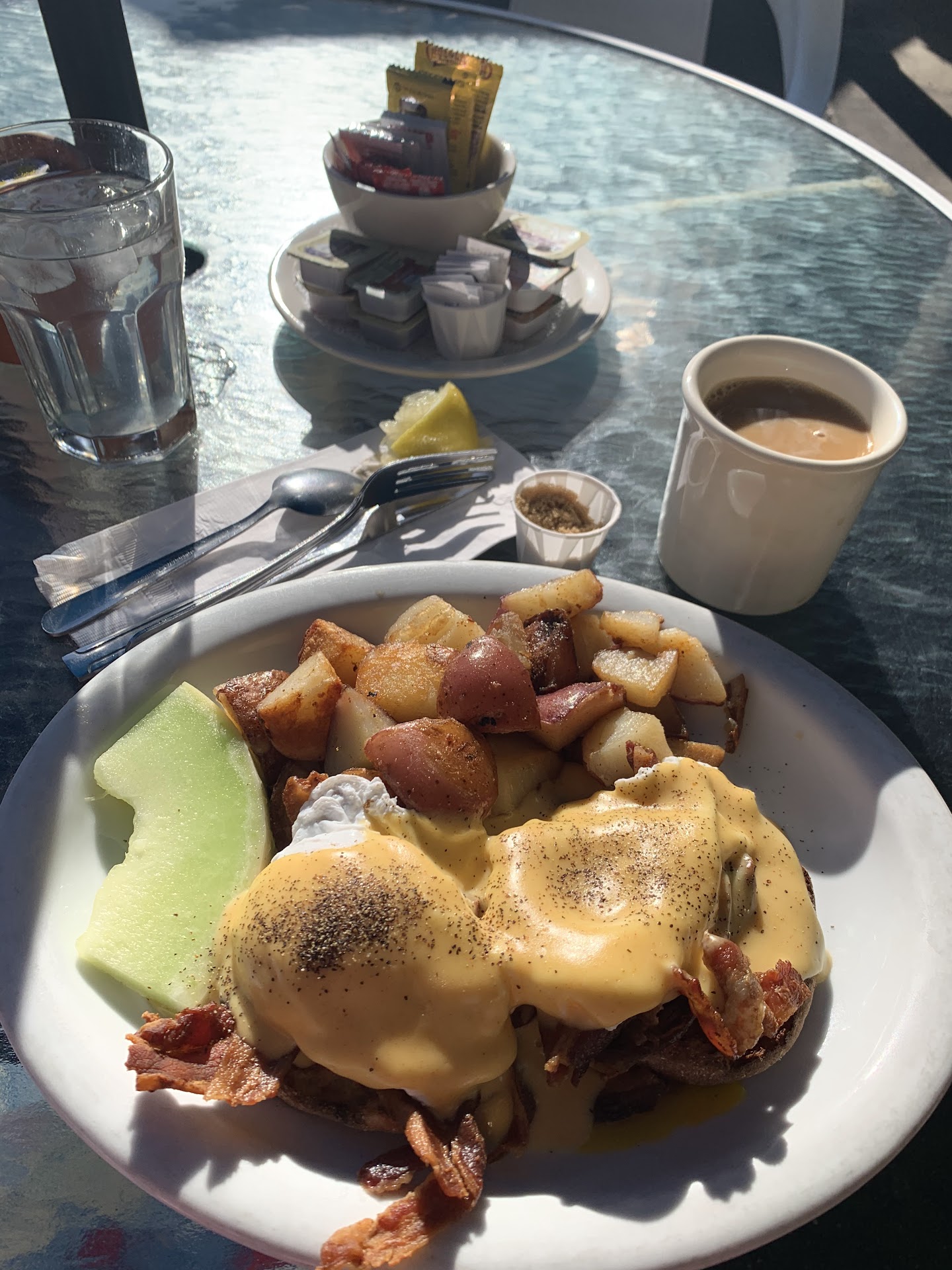 Read moreYou guys, I just ordered the California eggs Benedict. It's the best vegetarian eggs Benedict I've ever had! Grilled (good) tomatoes with garlic, ripe hass avocado, perfect hollandaise, perfectly poached eggs, whole wheat English muffin and fresh fruit. I always prefer to cook at home but this was worth paying for. Stellar, friendly service, great coffee and mellow atmosphere. All the benefits of fine dining with out the pretentious snobbery. My husband ordered traditional eggs Benedict and added grilled jalapenos and they didn't even make him feel like a weirdo about it and he got 2 fresh jalapenos, grilled like a pro. I never saw the bottom of my coffee cup, thanks for a...