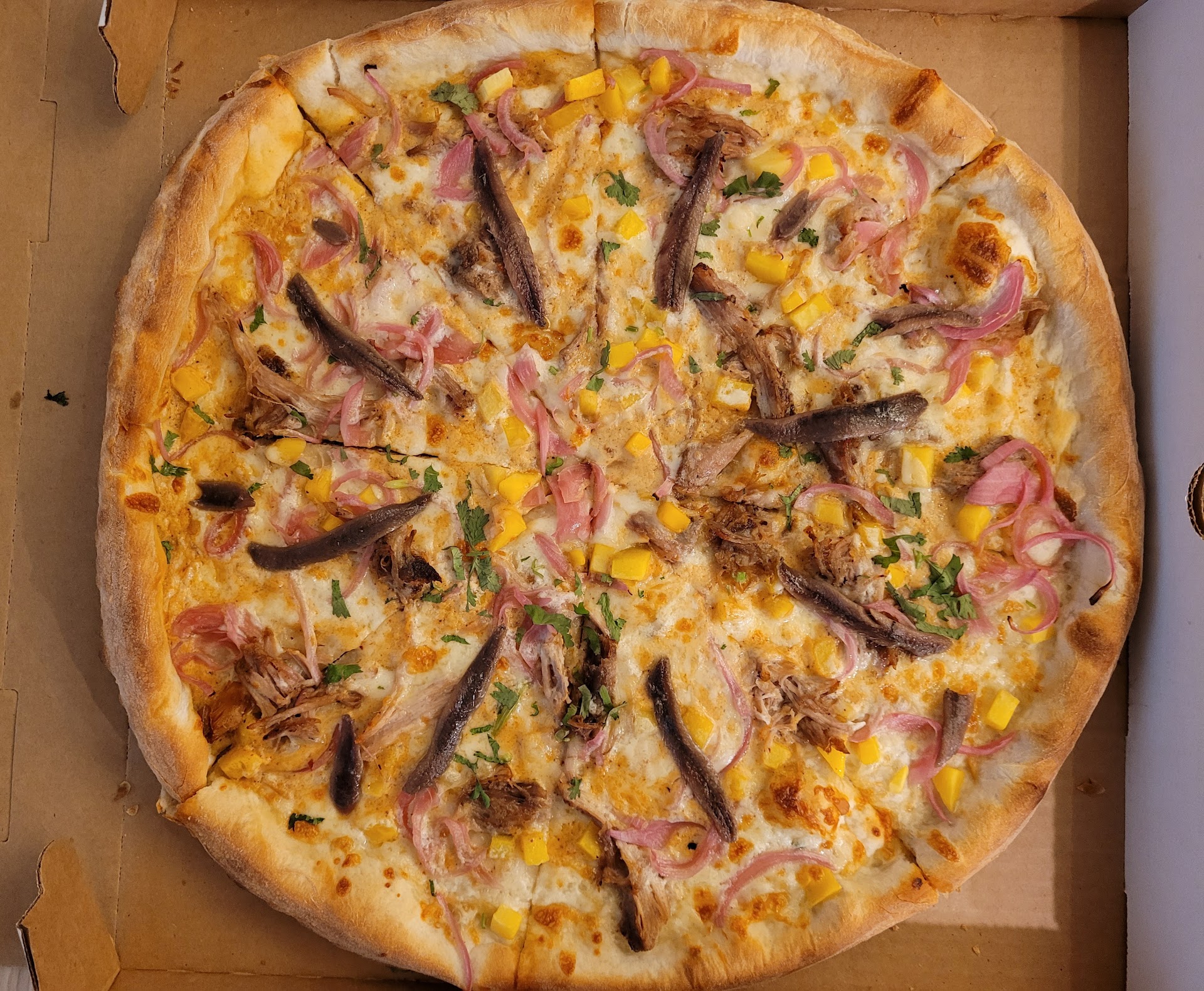 Read moreCreative topping combinations but average pizza overall. Tried the El hefe pizza which had pulled pork, pickled onions, mango, and cilantro. First of all, their dough and the crust was average at best: it was definitely a thin crust, but not crunchy as it should be. Their toppings on the other hand were amazing (except for the cilantro part): pulled pork was great and it was similar to having a pulled pork sandwich with pickled onions. However, it would’ve been nice if they added those toppings in greater quantity as some parts ended up being boring. The biggest letdown for me was the cheese or its lack thereof: I could barely taste any mozzarella and the cheese layer was barely visible...