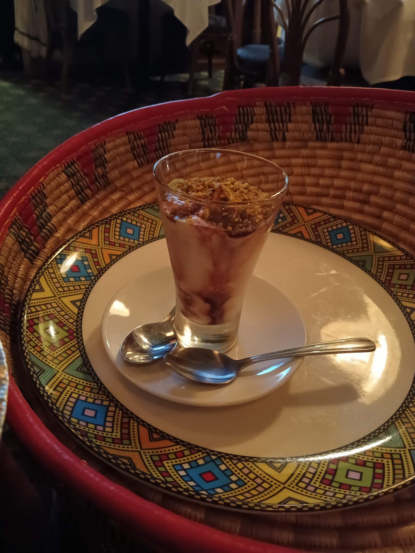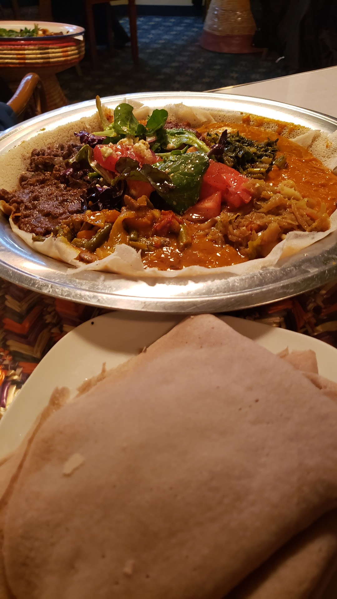 Me and my girlfriend went to Asmara for a date night a couple weekends ago. We had never tried Eritrean food before, but it was close to the Havana dance club we were going to so it peaked our interest. I started off with their tea which was so woody, sweet, smooth and a great way to start the meal. I ordered the Derho Fitfit (spicy chicken over injera) and my girlfriend ordered the Alitcha Begeeh (mild lamb over injera.) The meal came fairly quickly, on a table with a basket on it and it was a new experience eating this way. Atop a handful of injera (a spongy flatbread made of teff flour,) our meals were separated by a really nice Mediterranean style salad. We were told we eat this with our hands (no problem for us) and we started off. The salad was very familiar with a nice light dressing that soaked into the injera nicely. The Derho Fitfit was really interesting, the flavor was spicy and sour and it was very tender. It was not a flavor I was used to but that made the experience even better. The spice level was just below too much (our server even checked in to make sure it wasn't too spicy.) While the sourness was just an unexpected but welcome addition. The Alitcha Begeeh was our favorite of the two but the contrast between the two may have made the meal better. It was a much more mild flavor that was familiar but still exotic. The lamb was tender and the sauce was hearty, also the potatoes and carrots included with it made it in between a light lamb curry and a stew. The injera was the vehicle for all this food and I will say it was a new experience. Its akin to tortillas as far as it's function but it's spongy and kind of like a wheat bread flavor. It wasn't the star of the show but an excellent vehicle. Then we ended the meal with a pistachio gelato and a coffee. This was such a great choice, the gelato was so creamy and the flavor was amazing with real pistachio and chocolate throughout, it capped off the meal perfectly cooling off the spiciness from the Derho Fitfit. My girlfriend said the coffee was very strong and the flavor completely unique to any coffee she tried before but was a great contrast to the gelato. Our server was very nice and asked us questions about our meal. She was very helpful guiding us through the experience and including information to help elevate our meal. Walking in this restaurant was clearly not like many we've been to before, the tables were very small and there was food on baskets and there was an Eritrean music video playing but by the end we were very comfortable and felt like the meal was more than...
