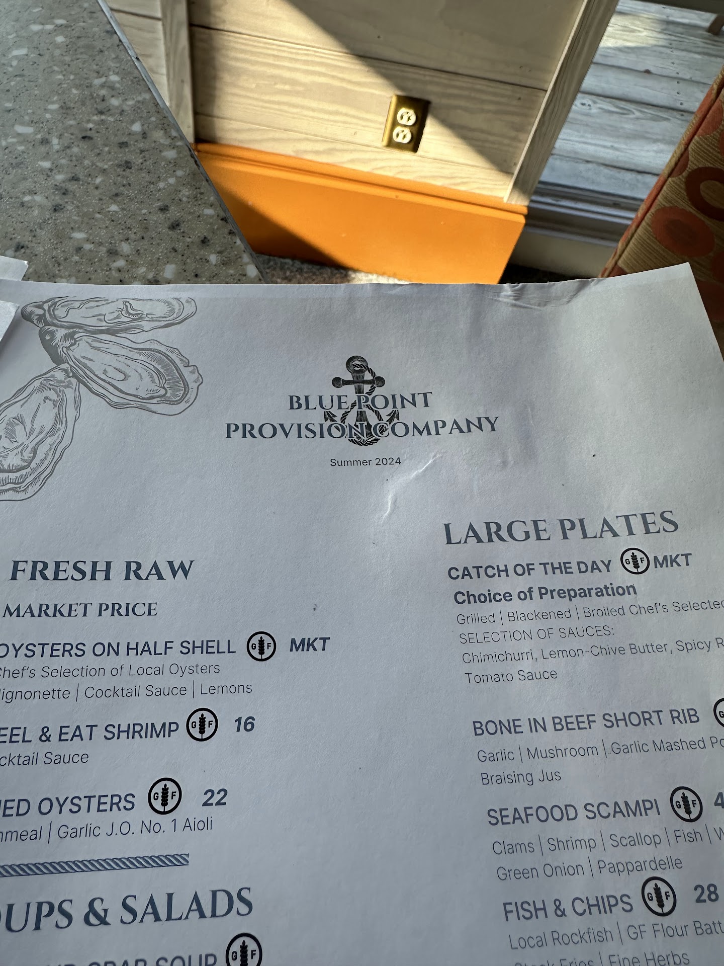 Read moreJust stayed at the Hyatt this past weekend. On check in the guy behind the desk told us The Blue Point is renowned for its seafood. The crab bisque contained very little crab. Crab dip was ok, and did have crab, but was just ok. The menu posted online did not contain a lot of seafood but gave it a try. Only to find out the menu posted on line was for another restaurant in the hotel and the Blue Point still did not have many choices just some fish. Ordered a whole Vermilion Snapper. It came out smelling pretty fishy, just means its old, it wasn't fresh fish. It was dry and just tasted ok at best. I thought at first I was getting Red Snapper but I discussed it at length with the server. I did that because his Indian accent was so thick I had a hard time understanding him. Not being mean, just the truth. We were thinking about taking desert back to the hotel. Only to watch through the kitchen window to see one of the cooks pull an already made desert pastry out of the frig and wipe off the bowl and put it in the microwave. We went back and got desert at the hotel which wasn't good either. Its a decent hotel. Just don't...