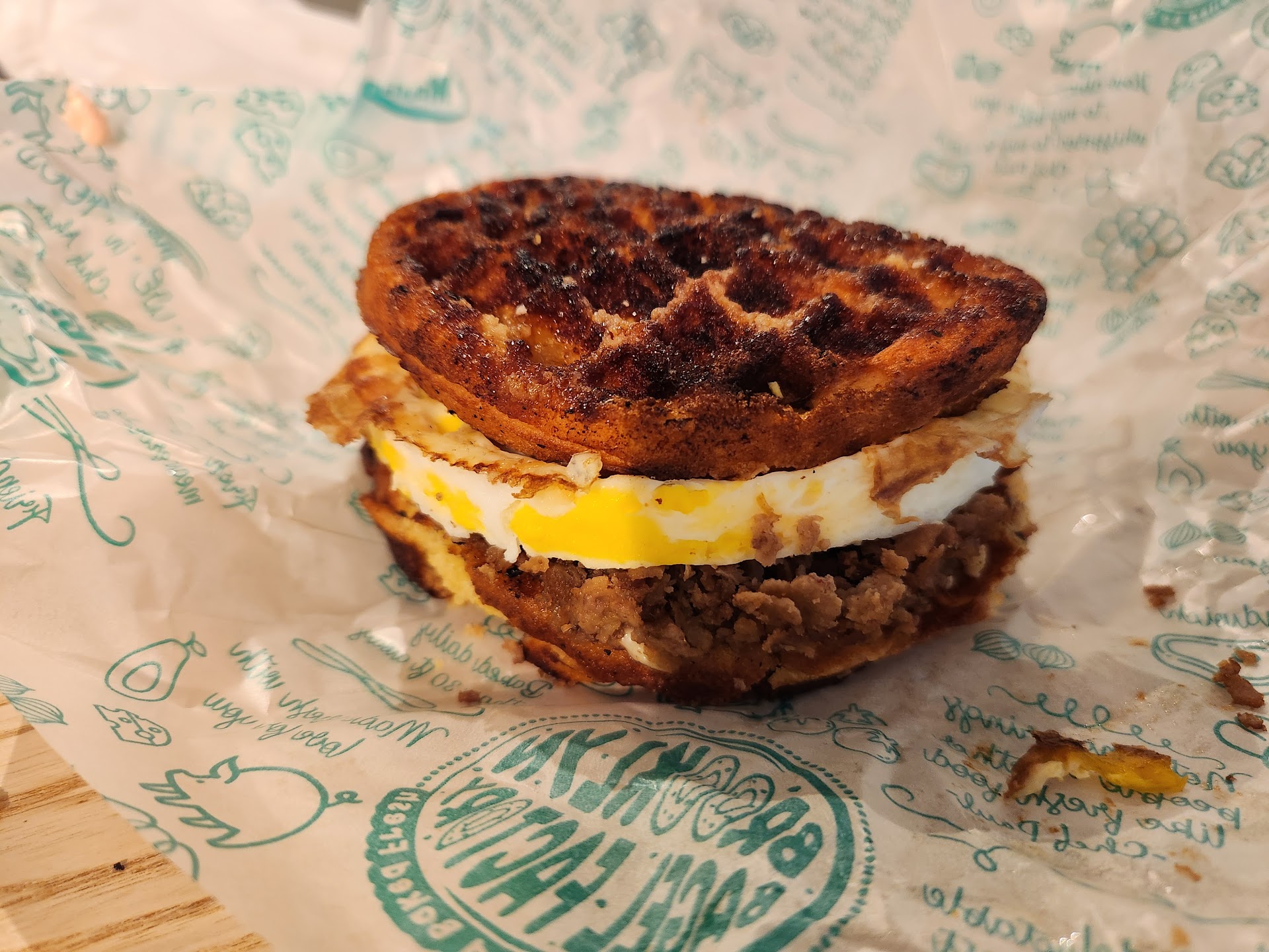 When I finally got my order, I was a bit disappointed. The Belgian Waffles were soggy and dense. Even the Waffle Steak Egg & Cheese sandwich, while better than the standalone waffles, failed to impress. The dry steak combined with the heavy waffles made for a cumbersome eating experience. Simplicity usually shines in a well-executed bagel and cream cheese, but even this staple faltered. The strawberry cream cheese lacked texture, making it less than appetizing to look at, let alone eat.