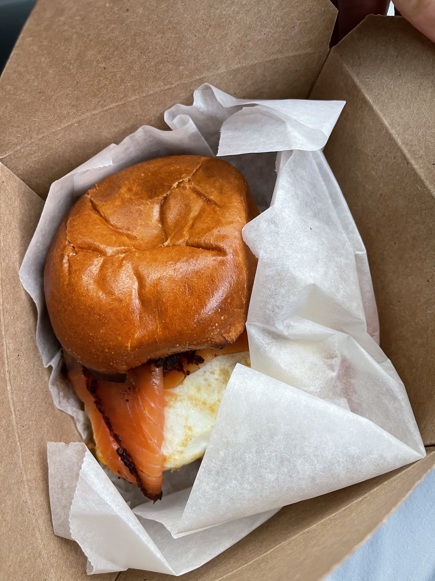 The food: My partner and I both ordered breakfast sandwiches. These were really legit, I won’t lie. The melted cheese reminded me of raclette, and the everything bagel was fantastic. I would say my Bacon, Egg, and cheese was well worth the $8. I’m a little annoyed that my partner, who is vegetarian, didn’t have a lot of options to put on her sandwich, and was left with just egg and cheese. Honestly this would be okay if not for the fact that her sandwich was the same price as mine, and for what she got, definitely NOT worth $8. As a suggestion, it would make more sense to have a base price for the egg + cheese sandwich, and then an additional charge ($2-3) for the added meat, etc. Just didn’t feel right paying the same, but for explicitly less.