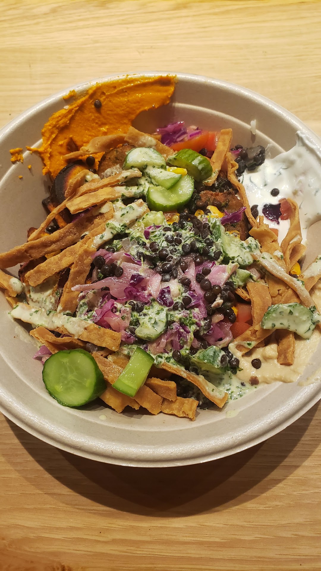 Finally, I added most of the toppings and lemon herb tahini as my dressing. Persian cucumber was new to me; it didn't have the same taste of "summer" that cucumber typically brings, but it was quite good. The tahini was also delicious, and clearly popular for a reason.