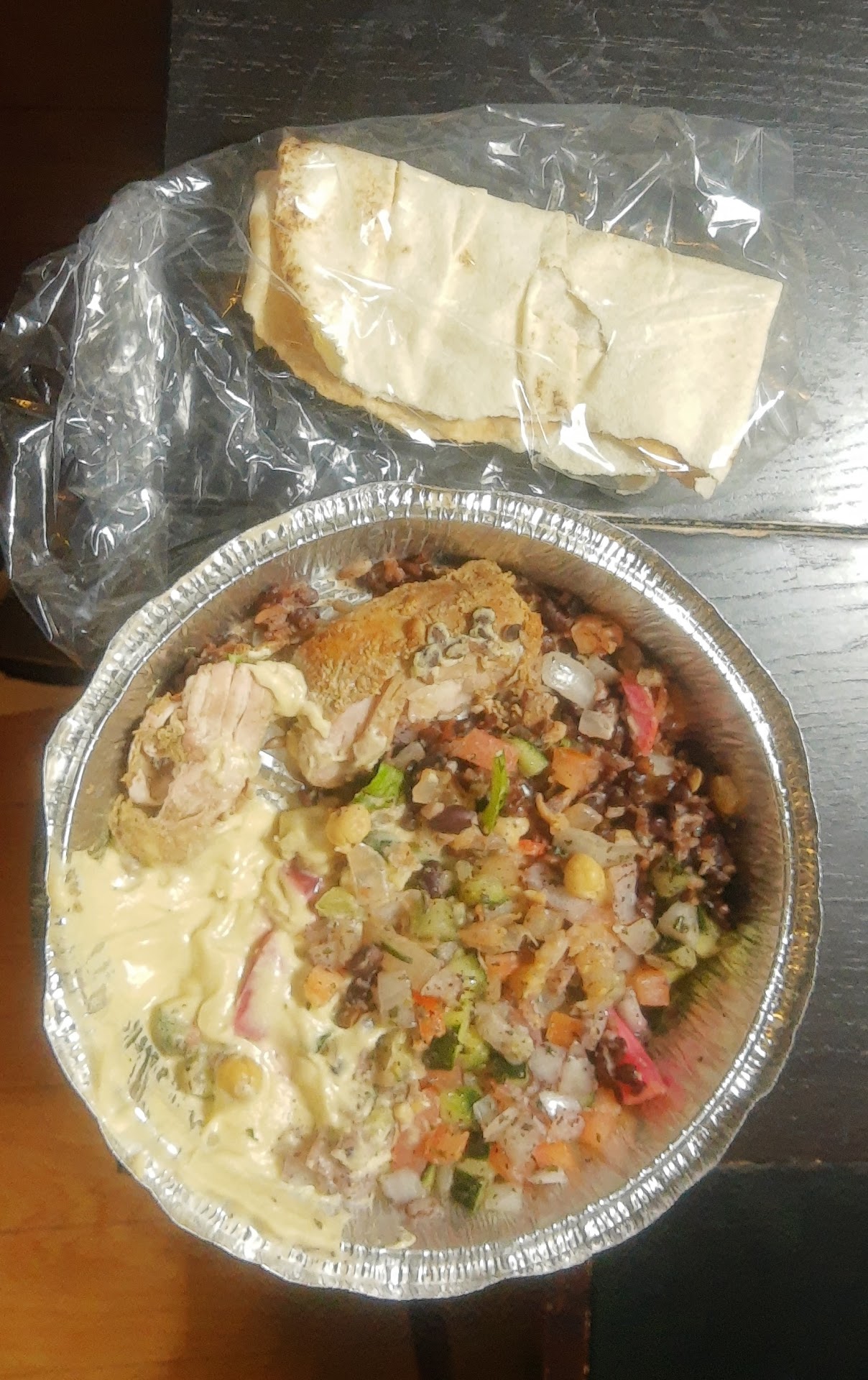 Also, regarding sanitation: Didn't touch the pita bread I was given since it was handled "raw" by a GLOVELESS cashier who alternated osculating money/cards at the register with touching food -- no, he did not wash or sanitize his hands first. (EW!) Ample kitchen staff did not wear masks or hair restraints of any kind such as a hat, hairnet, or bandana; nor did they ask patrons to wait outside despite a group of 12+ bar-flies entering all at once into the small waiting area (3' x 4'-ish) at "bodies touching" proximity. Seemed like the perfect breeding ground for foodborne illness and COVID/flu...