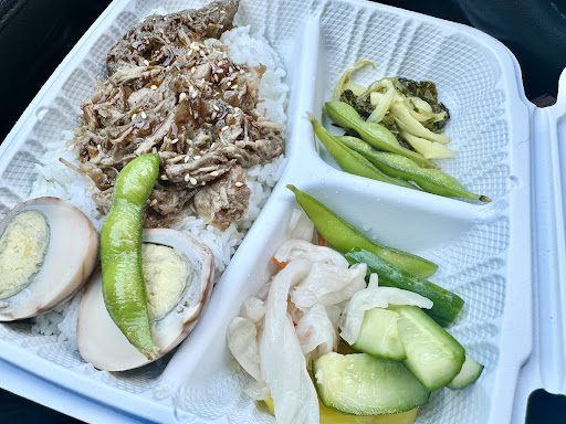 I did one of the Bento boxes with pulled pork, tea eggs, edamame, rice, and veggies. It is absolutely delicious but definitely a little pricey. It was $19 for my tea and my food. But I do love the cafe and the people are super kind.