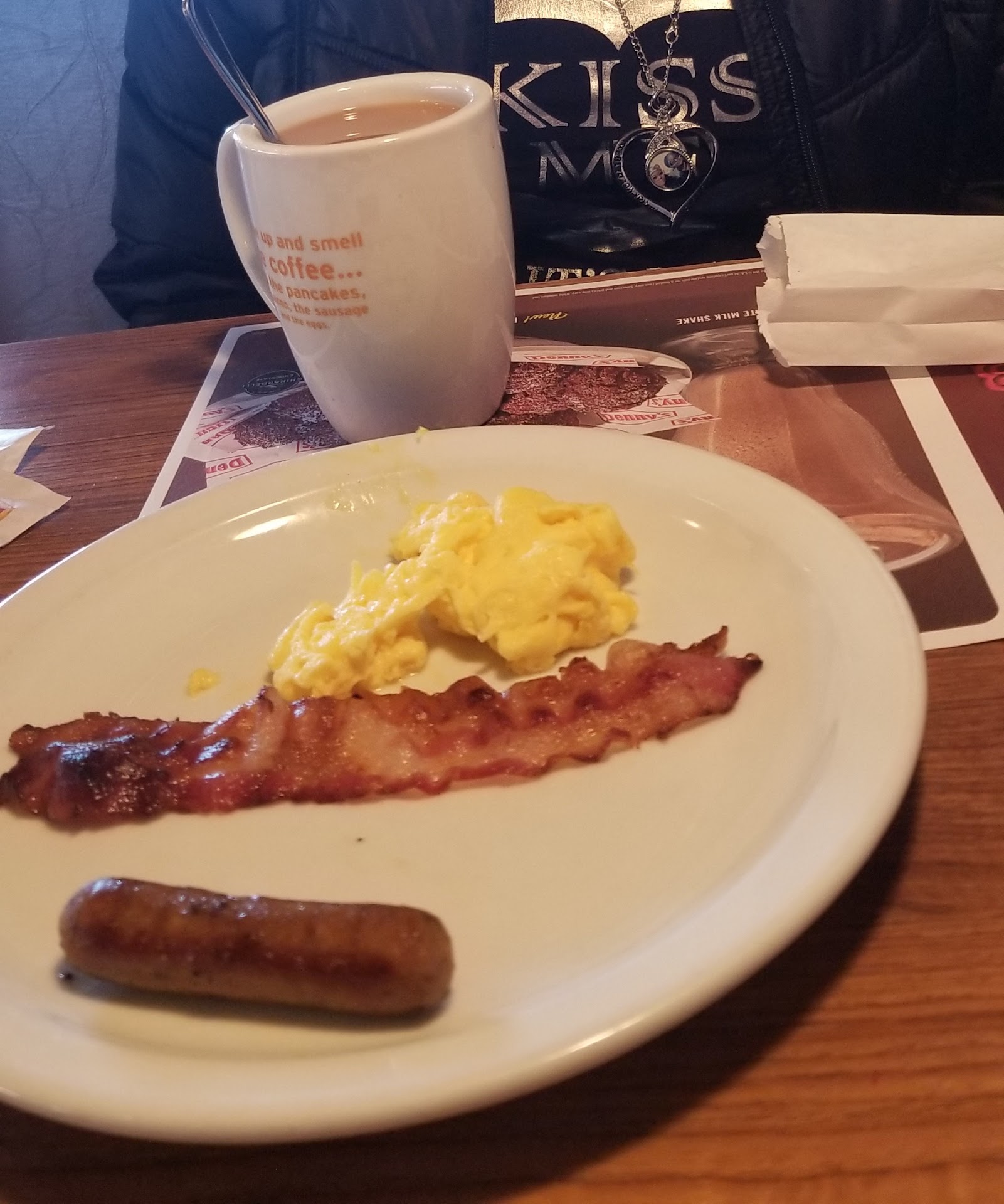Our food was good. I order the lumberjack Slam breakfast. The price was about $17.00 because I upgraded our pancakes to the cinnamon rolls pancakes. The pancake was good and the eggs and meat was delicious. Only thing I wish they did was cooked the meat a little more but it was still good all together.