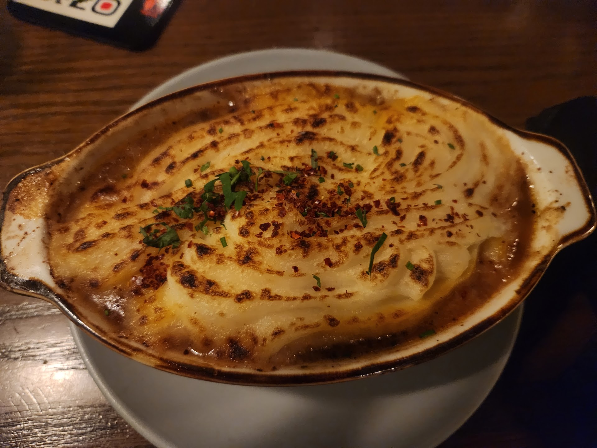 Read moreStarted with french onion soup. This is one of my barometers for how good a restaurant is. The soup it's self was rich, and flavorful. However, it was advertised as having a brioche crouton. It was anything but. They literally just tossed the botton half of a hamburger bun on top, and melted cheese over it. The result was a big pile of soggy bread mush. You can't just toss half an untoasted hamburger bun on a french onion soup and call it a crouton. A crouton is crispy by definition. A proper crouton will remain crispy in the soup for a pretty long time. Definitely a fail on that part. As for the main course, I ordered the shortrib cottage pie. (Pictured below) Presentation was nice. However the "stew" underneath was so thin, it had the same consistency of my french onion soup. I mentioned it to the bartender, who tried to explain it away, not knowing I soent most of my life as a chef. It just annoys me when servers try to explain cooking to me when I point out a mistake. I know how it's supposed to be. Anyway, the mushrooms were super rubbery, and the whole thing tasted of uncooked wine. That happens when you don't fully cook out all of the alcohol. Such a shame. It could be so much better if they just took the time to cook off all the alcohol, used a proper roux. All together, I give this place 3 out of 5 stars. I will give them another chance at some point, because it was obvious the ingredients were fresh, and of top quality. The execution was just a...