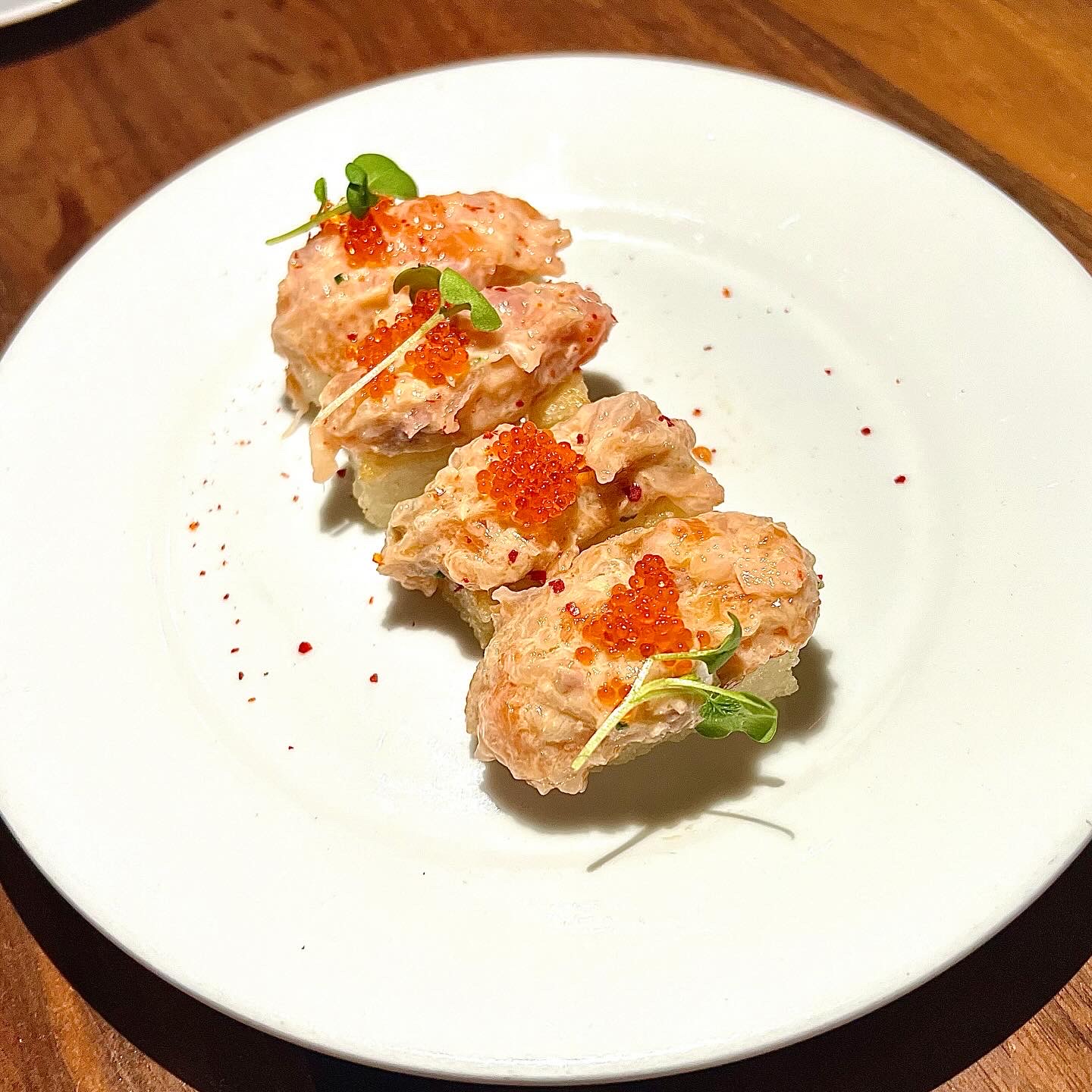 There were four of us and we ordered 2 dishes a piece and 2 desserts to split. We ordered the Parker House Rolls, which were delicious and reminded us somewhat of bao bread, highly recommended. The fried chicken sandwich was also very good, though it was a bit difficult to split between four people. The Manti was the table's favorite dish. Everyone found the flavor to be exceptional. Our only (very minor) complaint was the dish came with 7 ravioli, so we had to fight over who only got 1! We enjoyed the clam garlic bread, though we were not blown away by it, especially compared to the Manti. The charred avocado, cucumber salad, and silver queen corn were all hits. The corn also had the cool effect of parts of it still moving when brought to the table. The burger was also a very solid choice. The patty itself was done perfectly, but the real star was the buffalo pickles!