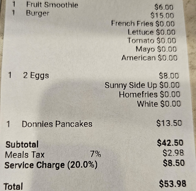 Just to make sure 20% service charge was added intentionally, I asked the server and the server mentioned it is included on all items. I told the server this should be disclosed beforehand, and the server shrugged and responded as if it's none of their business and seemed annoyed.