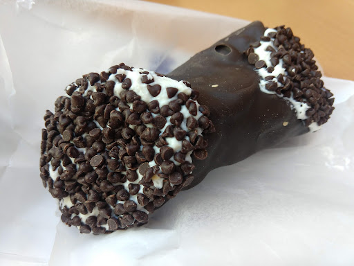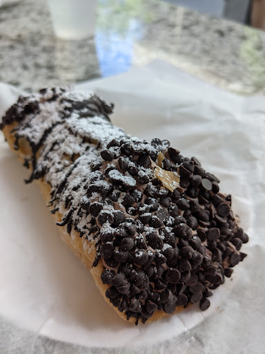 Our Cannoli was way bigger than we thought and we're glad we didn't get two haha! It was filled with chocolate mousse and dipped in mini chocolate chips on both sides and drizzled with chocolate on top and they ask if you want powdered sugar to top it off before giving it to you. The mousse had a light chocolate taste which was nice and the Cannoli shell itself was huge and crispy with some thickness to it. It wasn't thin or brittle and didn't fall apart when you ate it until like the last bite. For $5 it was a fair deal.