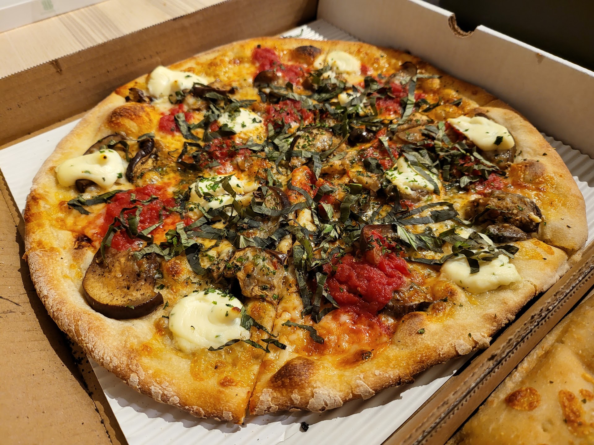 In the search for a lighter, less oily option, I chose the veggie pizza loaded with eggplant, ricotta, and basil. However, its unusual sweetness took me by surprise and didn't quite hit the spot. The combination, while interesting on paper, seemed to miss the mark in terms of a satisfying savory pizza experience. On the other hand, the two-cheese garlic sticks were a definite hit. Rich in flavor and not too heavy, they were excellent when paired with the accompanying pomodoro sauce.