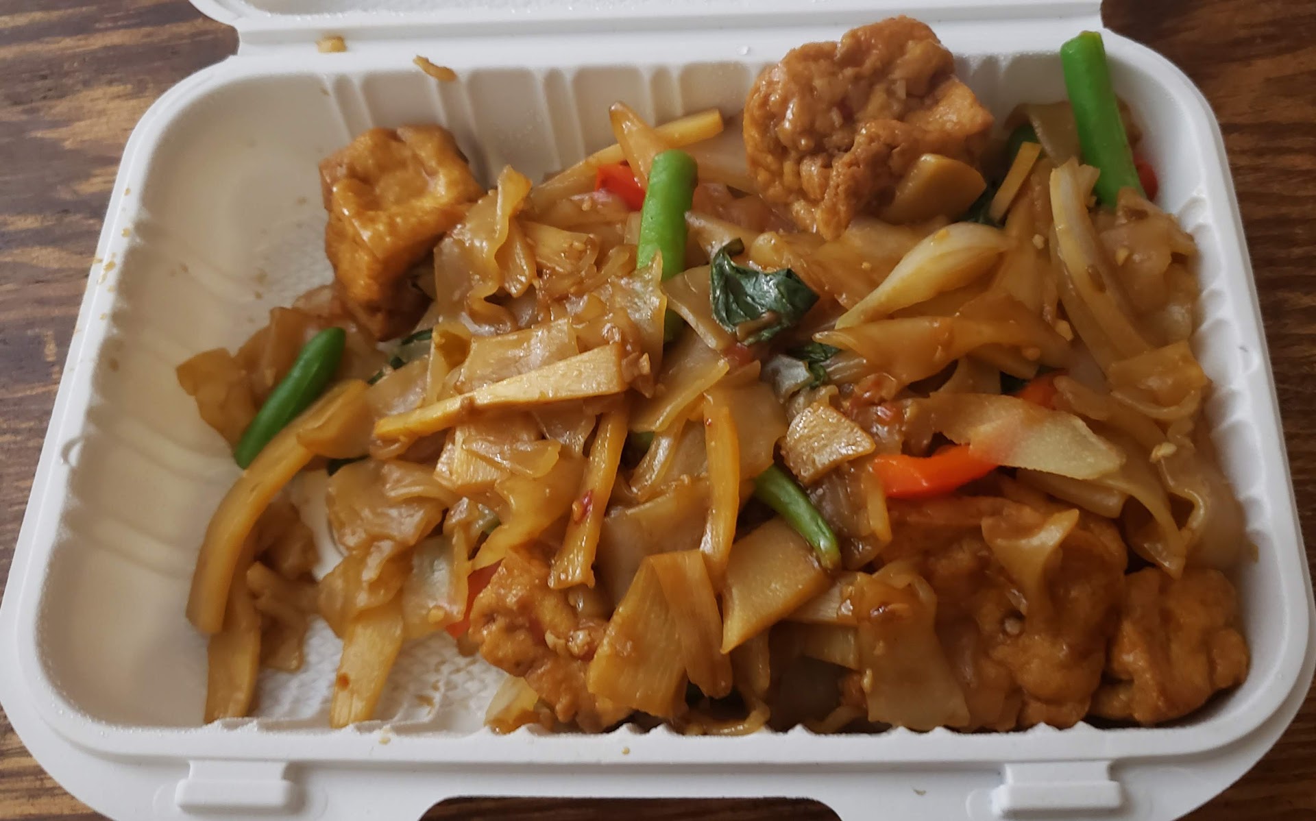 We got the potato puffs as an appetizer, which were nice to try one time, and I sprung for drunken noodles with tofu. Given that it was already vegetarian, I was hoping for more vegetables in the mix, but as you can see from the picture, the splashes of color (green beans and bell peppers) are pretty sparse. I actually wanted the medium spice level but got mild - I'm not sure if it was user error or a mistake on their part, but I definitely wish the spiciness was kicked up a notch. The portion for the entrée wasn't a ton of food, but the taste of what was there was quite...
