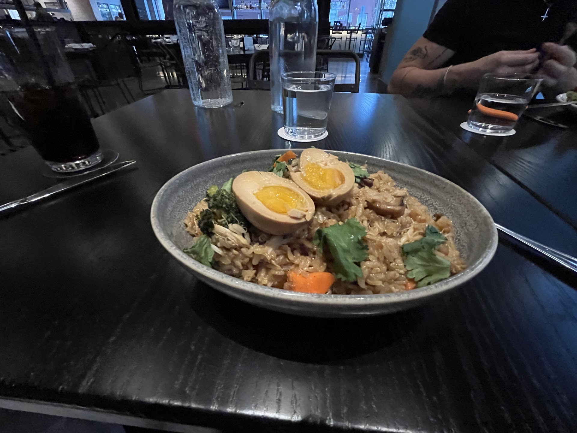The Crispy Crab Rice Bowl was odd. Nothing crispy about it. It was overdressed, rendering a very sweet and very vinegary fried rice dish. The saltiness of the soy egg, helped offset this effect a little by fork mashing it into the rice. Big hunks of partially cooked carrot, hidden under the rice, didn't jibe with anything. They were more like filler vegetables bulking things up at a Chinese buffet.