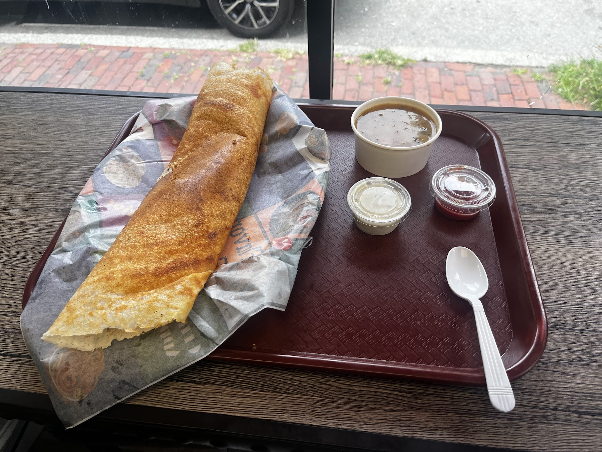 I ordered the karam podi masala dosa. It came with an unexpected side of soup and two… dipping sauces (sort of). I will say, the dosa itself was made perfectly. For a place that specializes in Dosa, they definitely know how to make very good ones.
