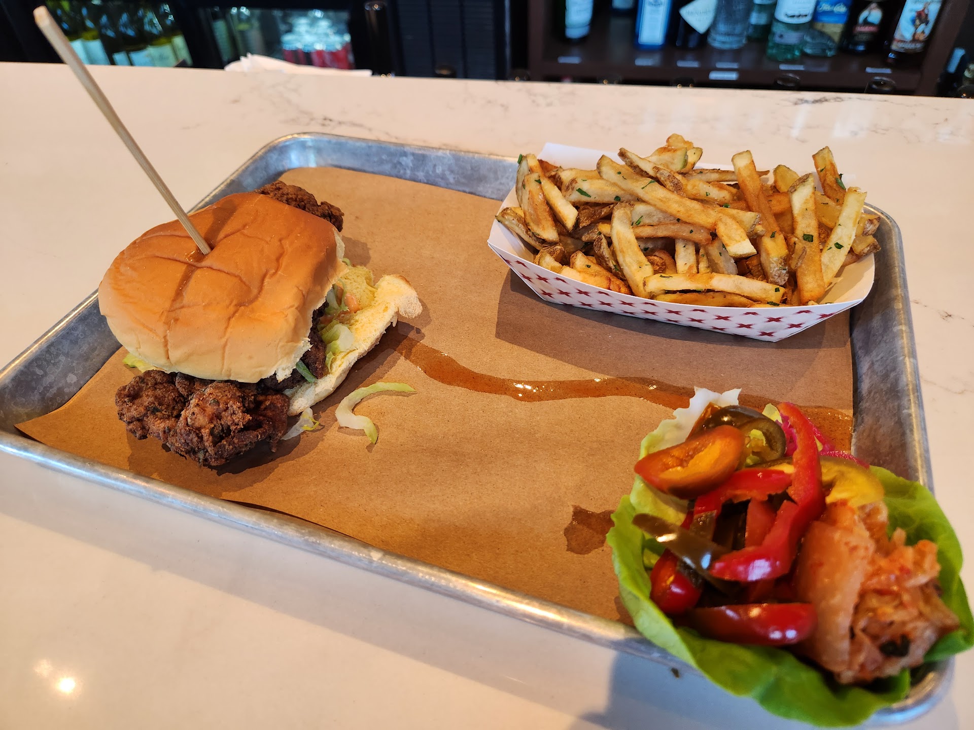 Read moreIf you're a hard working Joe stay clear. Nothing but a pretentious place trying too hard for it's resources for people that like to pretend. The menu says two patties for the burger but what it doesn't say is that it was two smashed patties which both didn't total nowhere near 4oz, it had too much sauce for my liking and it took some assembly but it was tasty. The fries where clearly over cooked and might even be clocked in old oil. Probably clocked in high temperature. They were saggy and some were raw. The misses ordered a sandwich and asked if it was spicy and the waiter said no, it had jalapeños in it. I ordered a Guinness that turned out to be alcohol free even tho the menu said 5% and 16 ounces which ended up being less. I'm a burger and beer guy, it took only one look to know those weren't 16 ounces. It got removed from the bill. The waiter didn't seemed very familiar with the menu. If he was new I wouldn't hold it against him, we've all been there. All in all you pay for them to pretend to be trendy of high quality but the food it's nothing special that would render the prices, beer list needs to be better, temperature both cold and hot needs to be better. Would not recommend,...