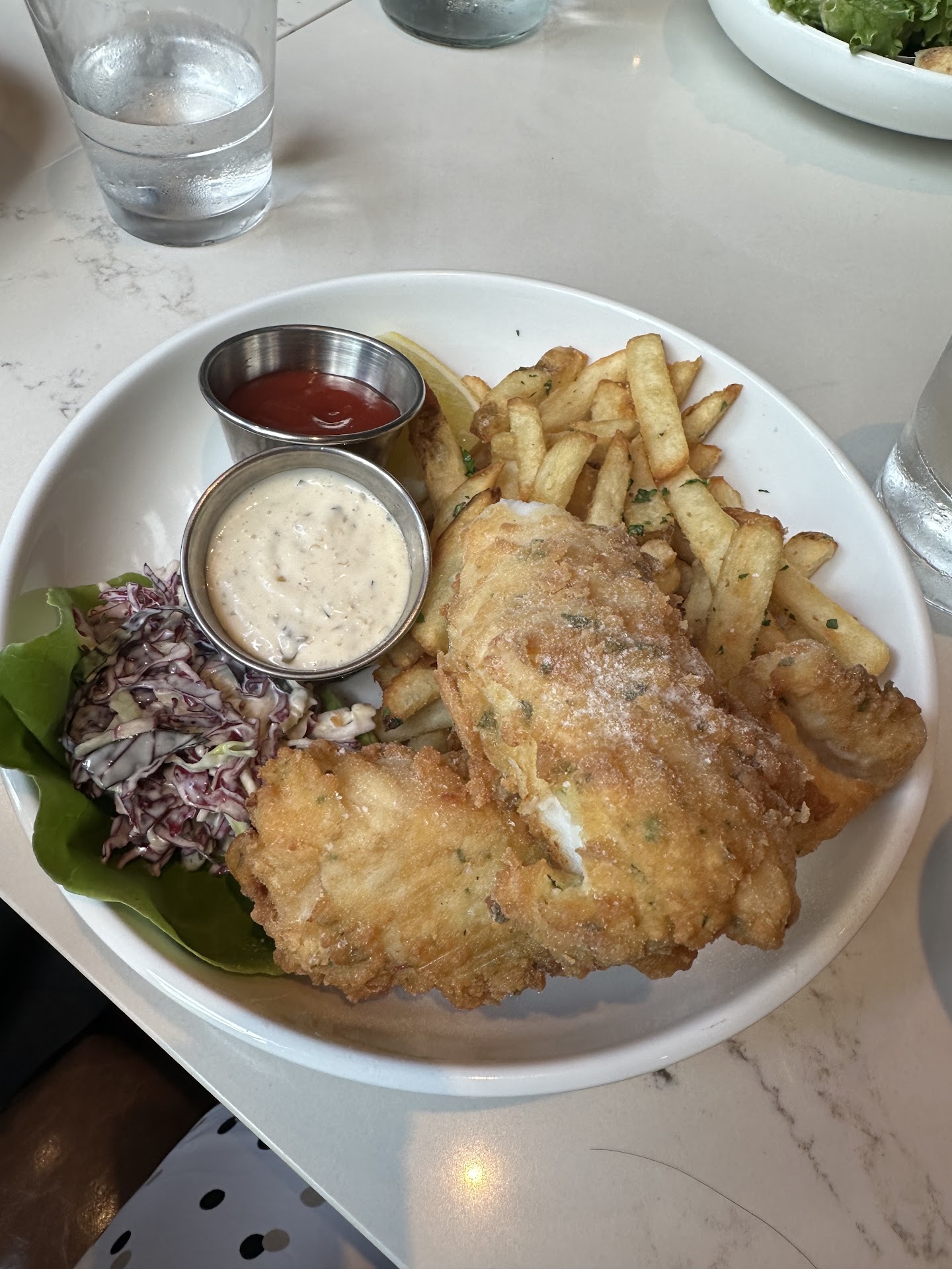 First, my fish and chips were delicious. Moist flaky beautiful fish with a light tartar sauce. Definitely a winner. Fries are also very yummy.