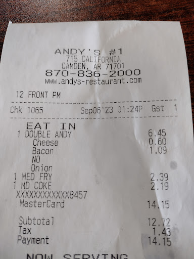 Read moreThe food was better than the average fast food restauraunt, like Mcdonald's; not saying Mcdonald's is bad. The atmosphere from what I saw was people friendly. The only issue I had with the whole experience was the speaker at the drive through menu was very staticy, and squealed. It was hard to hear what they worker was saying. As frustrated as I was by the malfunctioning speaker, the worker who took my order never missed a beat. We had gotten everything we had ordered. And she was plenty friendly. If she was frustrated too by that speaker, she bever showed it. Great customer service. It will definitely be a go to Restauraunt in my future trips to Arkansas. Thank you Andy's for hot...