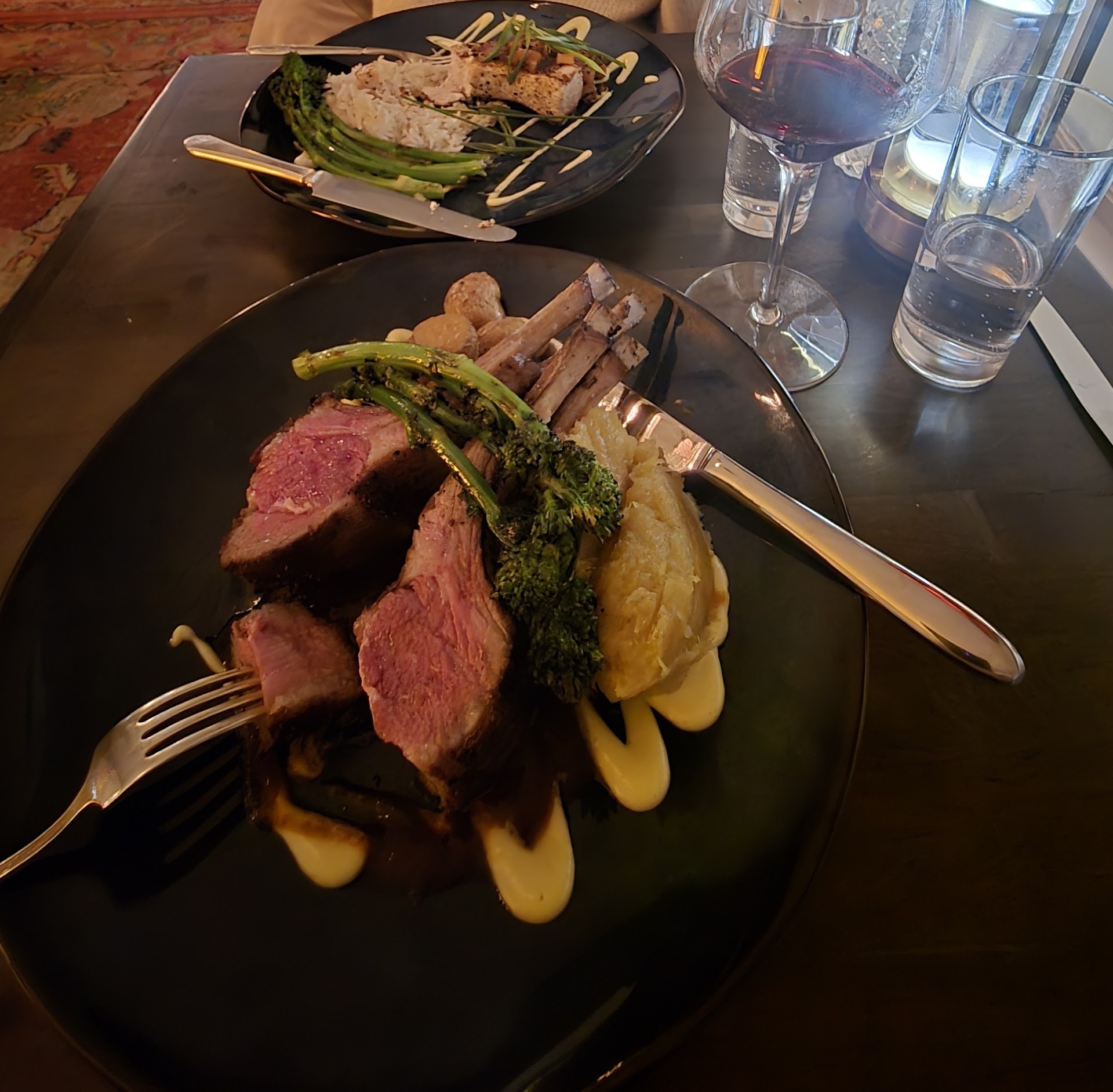 Our waitress was very friendly. The bottle of wine we ordered as well as our appetizers arrived in a timely fashion but then we waited….and waited…for over 45 minutes for our entrees. Eventually we were told they were coming. Unfortunately my wine glass was cleared during that time but I had not yet finished it. And, when our meals finally arrived, my halibut was room temperature/cool at best. My husband’s dish was okay, but not spectacular.