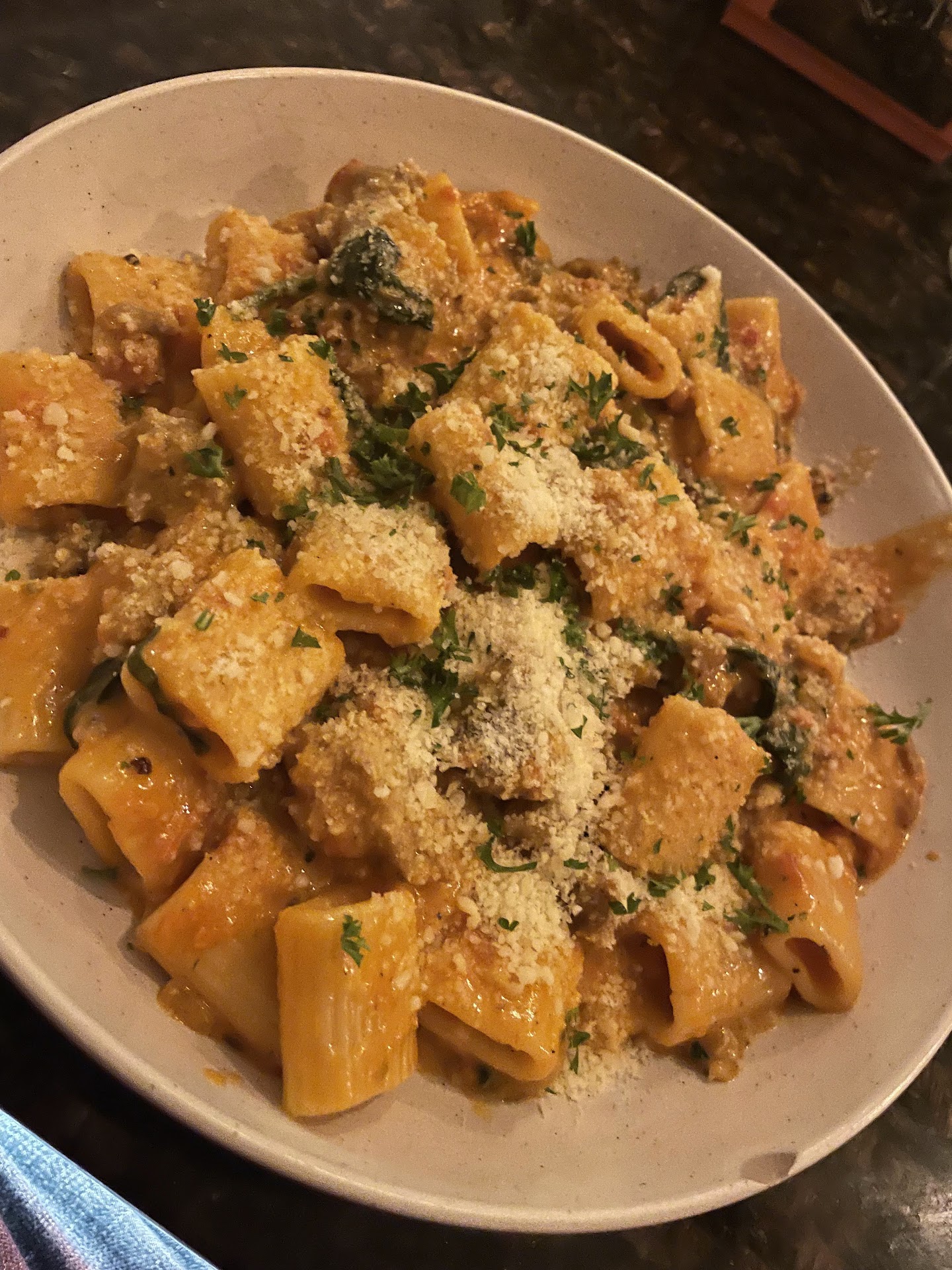 We both ended up trying the vegetarian dish which we did not enjoy. It was smothered in sauce . It was also very overpriced at $25 apiece. The waitress brought us two small pieces of bread accompanied with red vinegar. She did not tell us anything about the bread or why it was served with vinegar . She did not offer butter or olive oil if we did not care for vinegar. We later learned there were two specials, both of which my husband could have eaten and enjoyed. Waitress never mentioned the specials. (We did not notice them written on a sandwich board at the entrance.)