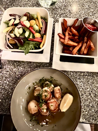 I gave this place a try, and given the late evening hour, I was able to secure a table outside with a great view. The experience was pleasant from the start; the server (Sarah M) had a very gregarious and friendly attitude; not to mention how attentive she was. The menu is full of seafood delights, and the daily specials looked equally tantalizing. After an engaging discourse with Sarah about the options I was contemplating, I settled on the Lobster corn chowder. Alas, they mixed up the order and I got the Clam chowder instead. I didn’t mind, and didn’t fuss about it. The clams were luscious and the soup was just the right texture. I then had the Maple pan seared Scallops, which were a delight. Definitely recommend this dish, especially since it is served with two sides. Normally, the sides are small accompaniments; but these were hearty portions. I had the house salad, which was very fresh, and sweet potato fries which were crisp and appetizing. Combining a very amiable server, with a hearty quintessential Maine seafood meal, I could not have been more satisfied.