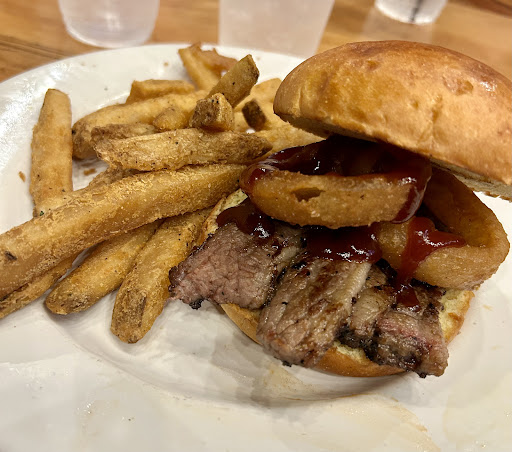 The atmosphere was great. Server was very pleasant (Baily). Live music was good. Drinks were good. Food was NOT good. Three out of five entrees were inedible. 1. Ribs needed a knife to get off the bone. 2. Brisket French Dip was extremely tough and they left huge pieces of fat on it (it was sliced incorrectly: flat and with the grain). According to the menu it should have come with peppers and onions, but those were not on the sandwich, and fries were cold. 3. The PBC Triple Pig (pulled pork, ham, bacon): the ham was tough, the pulled pork must have been sitting for hours in a warmer because it was rock hard, the bacon was under cooked. Our server agreed with our complaints when we showed her the condition of our food and went to speak to the owner/manager(?). They discounted the bill for the sandwiches, but then added a charge for the sides that are included with the entrees. Overhearing some of the servers talk with each other it was heard that they had recently fired the GM and were having big issues with the kitchen.
