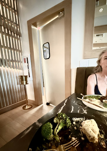 Meanwhile another couple was brought to a nearby table and refused to be seated there due to the unsightly door, I started thinking that was a smart choice. There was also a 4 top seated slightly further away but will a clear view of the door and kept looking and talking about it. That area of the restaurant has a dense amount of tables, so unfortunately, there are a lot of tables with a view of that door. Given the number of tables with a clear view of that door, and the fact that the server told us itâs not a main kitchen entrance, why they wouldnât cover it with thick curtain panels to block the light, obscure the ugly door, and dampen the noise from the other parts of the kitchen that were clearly heard through that open door. We spent a lot of money on our dinner and were very disappointed. Normally, we stay for dessert and coffee and we could not wait to get out of there. My husband had the ribeye and I had the filet. Both were prepared as we had ordered. They were tender and delicious. Mine came with asparagus and whipped potatoes. Both were good. Although the plate seemed to have been ready for a while because the food was not hot by the time we received it. I might give this restaurant one more try but if they try to sit us near that door, and donât have that door covered, I donât think weâll stay. We spent a lot of money on a very disappointing experience. when you have expensive price tags you expect a beautiful experience not just good tasting food and a server that smiles at you when they talk.