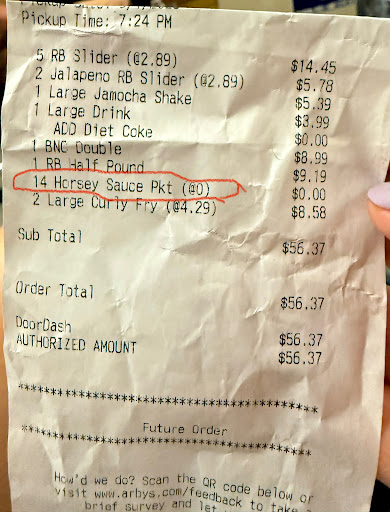 Read moreAbsolutely horrible. We did the "order ahead" on Arby's.com so we could just grab and go when we got there. We arrived on time when we were told it would be ready to pick up. But all the doors were locked so we had to get in the drive thru line, and wait, and wait. After 20 to 25 minutes waiting in the drive thru, we finally got our cold food because it sat for nearly a half an hour before we could pick it up, because we had to wait in the drive thru while all the cars in front of us placed their orders and waited for their food. And to top it all off, once we finally reached the pickup window, they claimed they don't offer drink carriers when we had 4 drinks in our order.